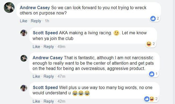 That suspension might explain why Speed also posted a Facebook Marketplace listing for his entire racing simulator setup for $7,500 as criticism grew throughout the week. Yet even as he hung up his virtual driving gloves, he couldn’t resist mixing it up with his detractors again, mocking a commenter by saying he was going back to “making a living racing.” In other words, bye, loser.