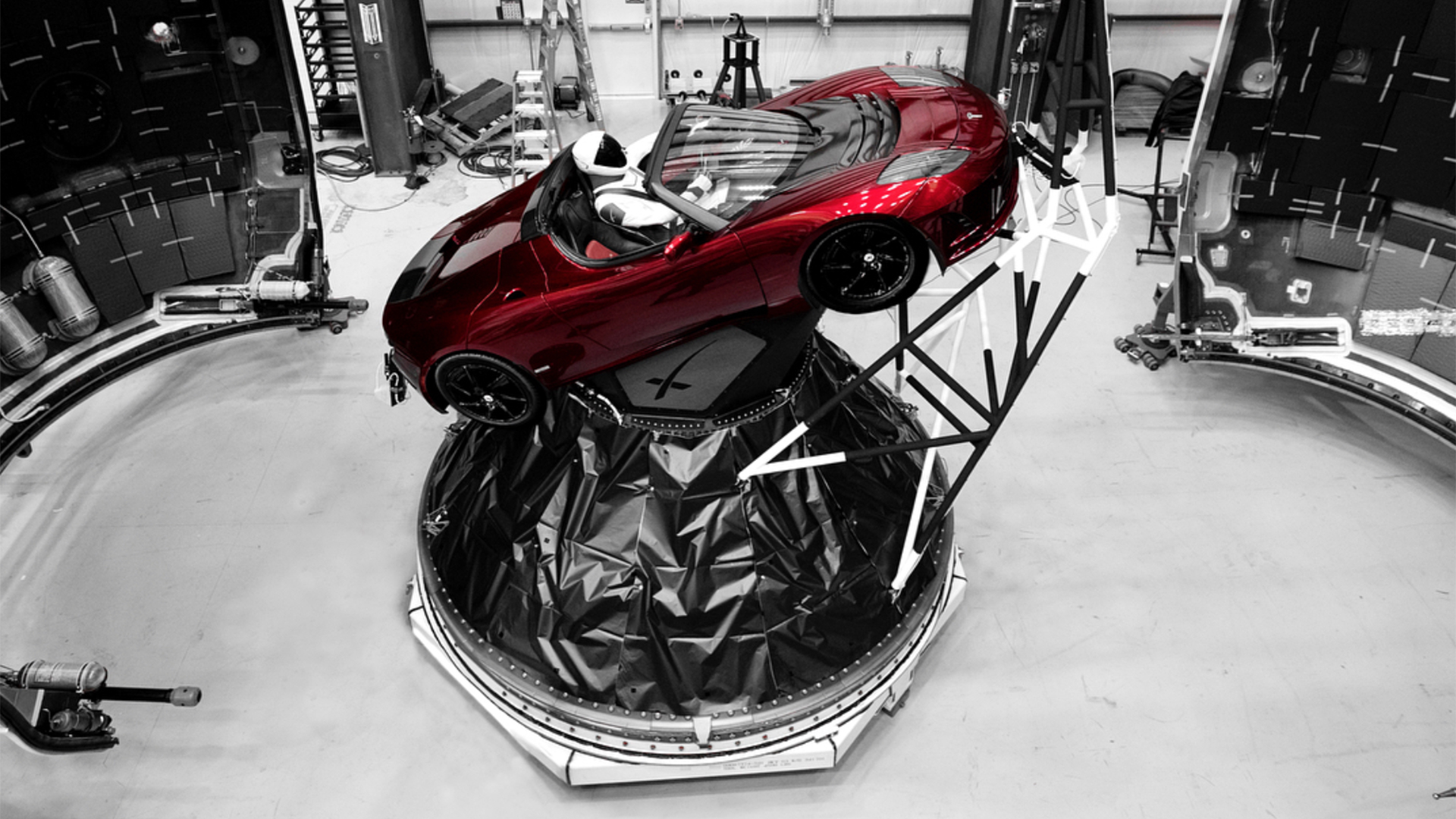 Musk shared a new image of the unusual payload on Instagram showing the original Tesla Roadster and its intrepid occupant (nicknamed “Starman”) ready to be loaded into the Falcon Heavy nosecone. SpaceX appears to have mounted cameras above the hood of the car, hopefully to capture some truly epic interplanetary driving footage. Eagle-eyed observers have also noticed what appears to be a tiny model Roadster with a spaceman doll attached to the dash.