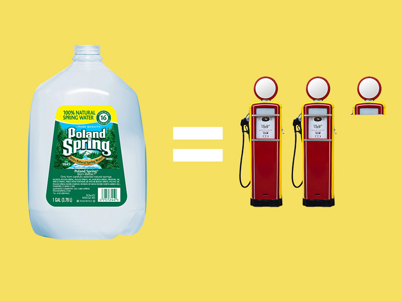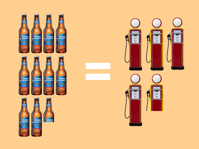 What follows is an illustration of the absurdity of our current state of petroleum. We undertook some light math and heavy photoshopping to show the disparity in price between gallons of our favorite goods, from beer to Butterworth’s. We’re making no consumer recommendations except to say that, while ketchup is delicious, gasoline makes cars do this.