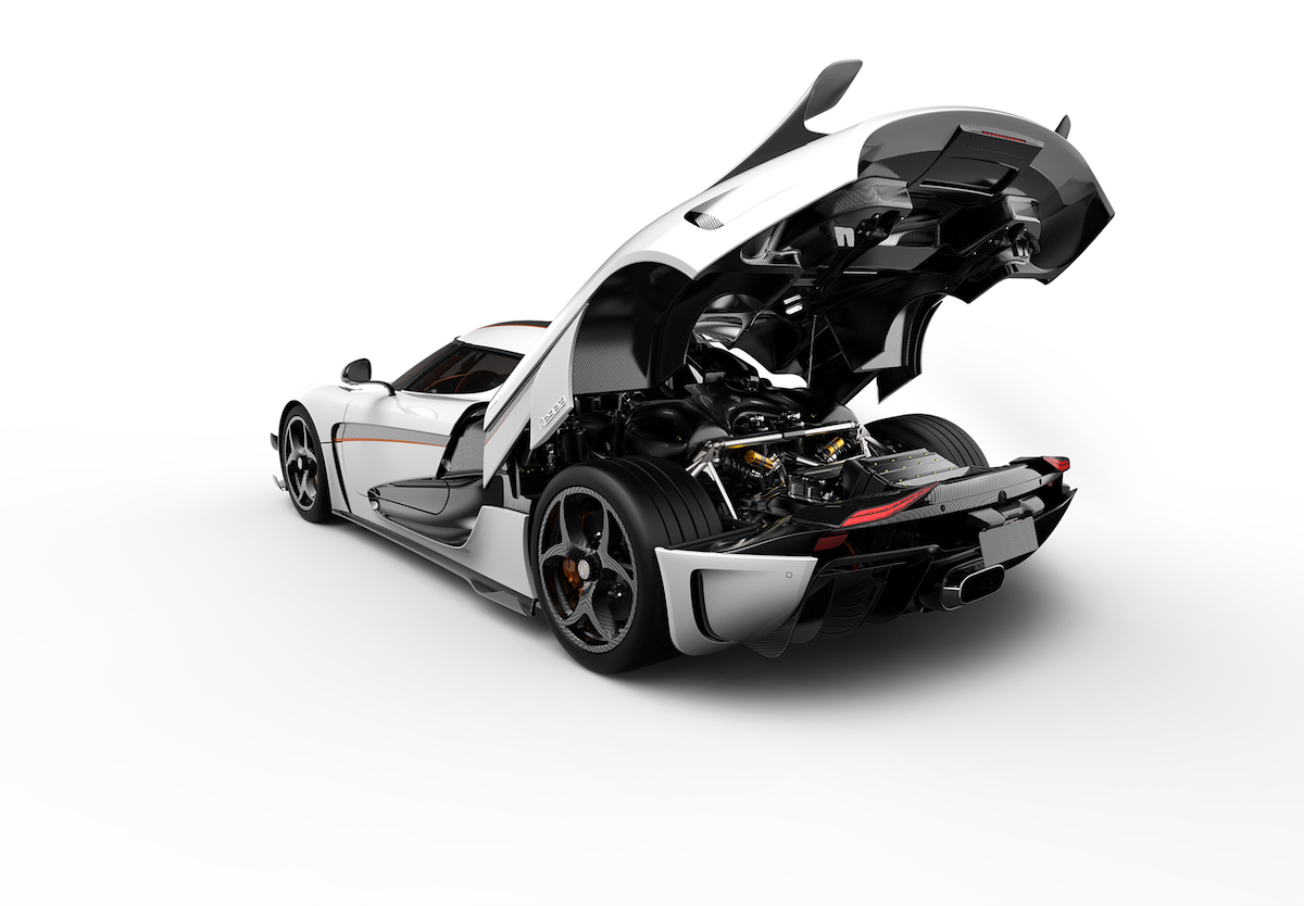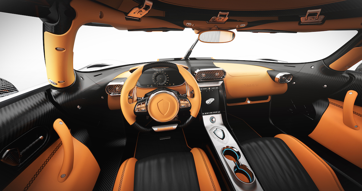 The second Regera is themed around sporty aesthetics, featuring a Crystal White with clear carbon fiber and Cone Orange exterior and Koenigsegg’s Ghost package. This option includes a more pronounced front spoiler and Ferrari FXX-K-like winglets that aid the Regera’s rear spoiler, generating 20 percent more downforce.