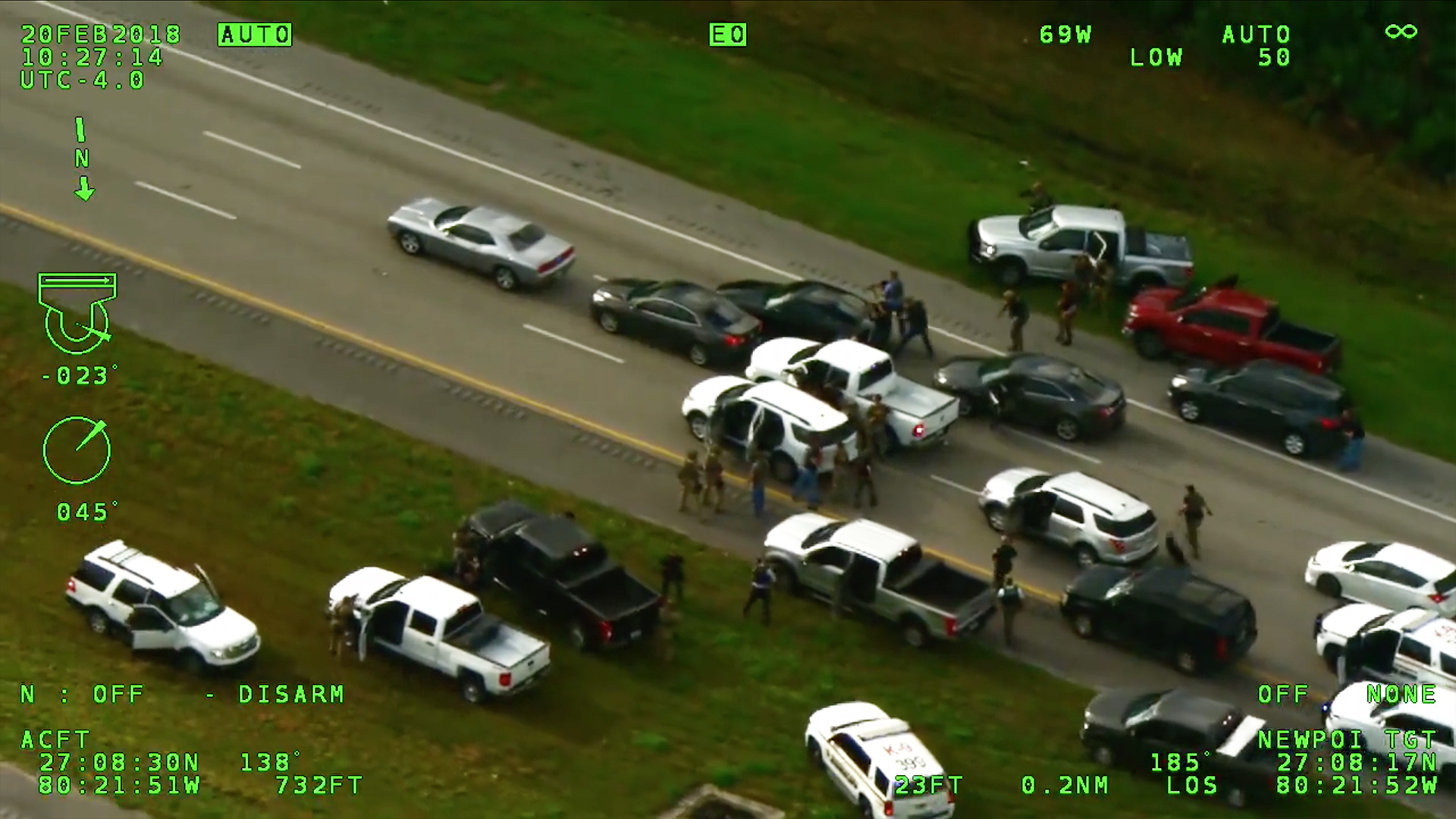Though the operation took place back on February 20th, police are only now releasing the helicopter video showing how it all went down. That morning, as the suspects drove south on I-95 in a dark Chevy Malibu, a phalanx of undercover units from the Martin County Sheriff’s Office, Palm Beach County Sheriff’s Office, Port St. Lucie Police Department, St. Lucie County Sheriff’s Office, and the FBI drove onto the highway behind them and began slowing civilian traffic.