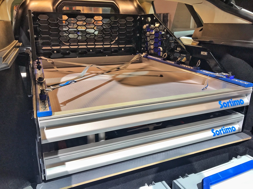A day later I found myself standing once again at the Sortimo booth, but this time, it was swarmed by a mix of potential buyers and company representatives. Sortimo is a rack and organizational company (what we call an ‘upfitter’ here in the U.S.) headquartered in Germany that together with Knapheide create high-quality truck bodies and upfits for fleet vehicles, i.e. trucks for utility crews, phone companies, etc. This time, the Tesla Model S had its doors and hatch wide open.