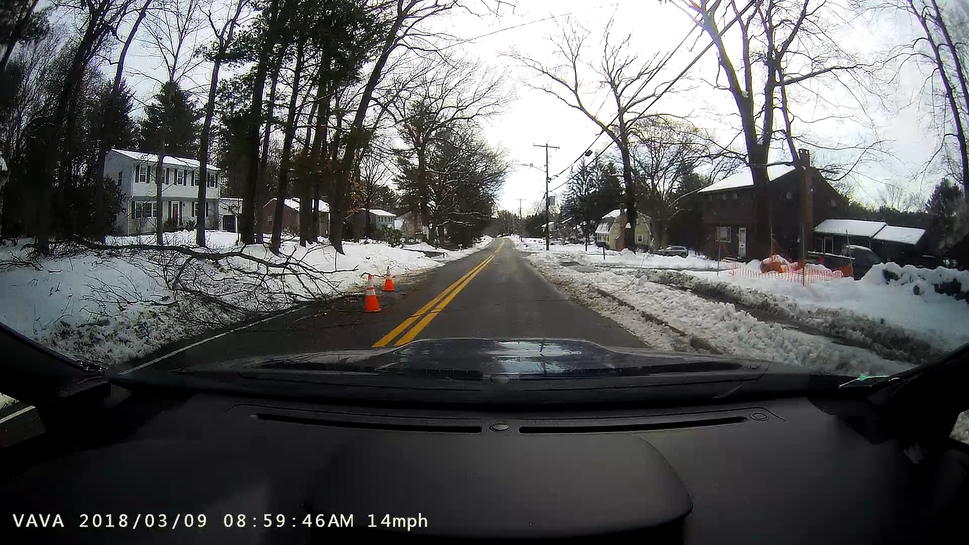 This is just one of many similar scenes I encountered in my travels Friday morning. There were no police or barricades other than the cones warning oncoming drivers of the large branch in the road, so this particular wire was safe to cross. The cones indicated that the situation had been assessed and deemed safe. If there were no such markings, it would’ve been time for a detour—one of several I took Friday.