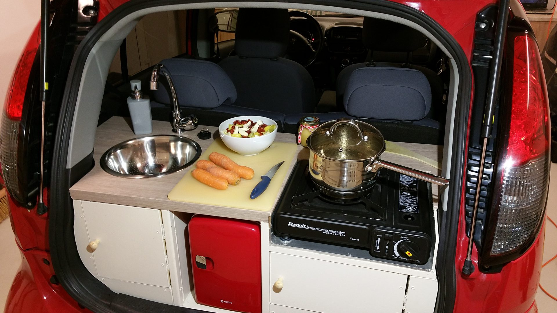 He first cut a frame for the kitchen out of wood, and added a vinyl laminate to create the countertop. The cabinets’ dimensions were measured to accommodate a butane gas burner, as well as a mini-fridge that can run off of the car’s 12-Volt power outlet.