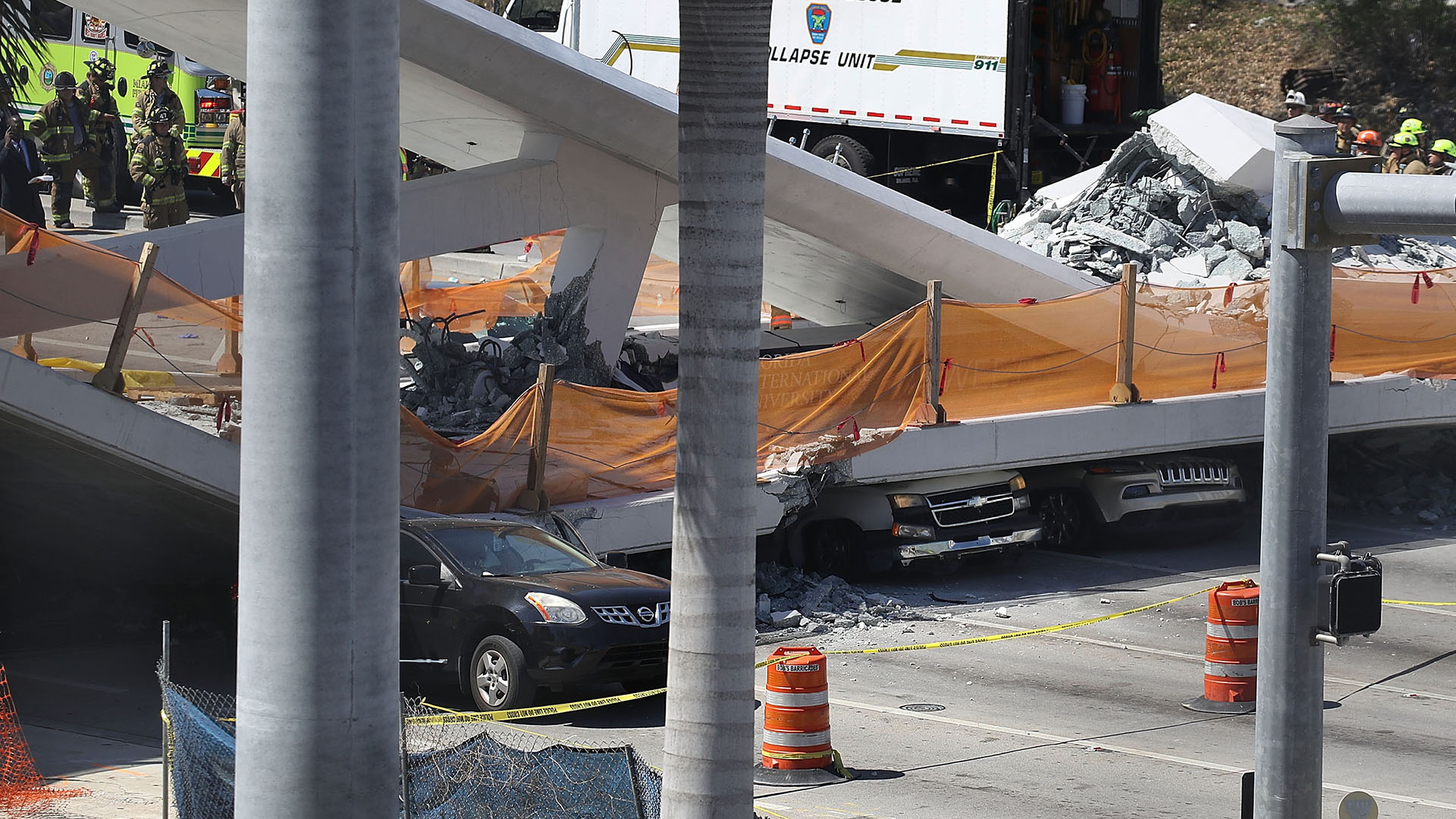 Images from the scene show the concrete slabs fell across almost the entire width of the Tamiami Trail, a major roadway that borders the FlU campus. Miami-Dade County Police confirmed that eight vehicles were stopped at a red light underneath the bridge during the sudden collapse, which caused an unknown number of fatalities. In video recorded by witnesses, the eeire sound of several stuck horns can be heard coming from the rubble.