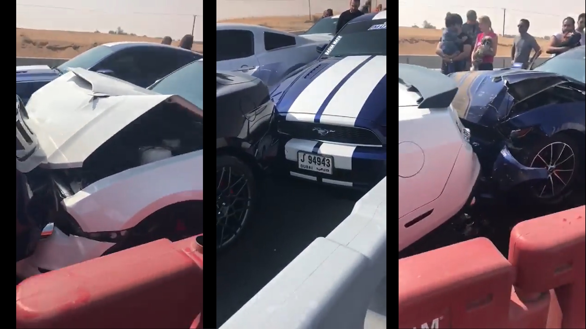 Somewhat surprisingly, the first ‘Stang crash video of the year doesn’t come from Texas or Alabama, but from the sand-soaked, oil-rich streets of Dubai. And yes, according to the uploader, this happened leaving a car meet. A Mustang gaffe of this magnitude (we count at least six Fords headed to the body shop) deserves the right soundtrack.