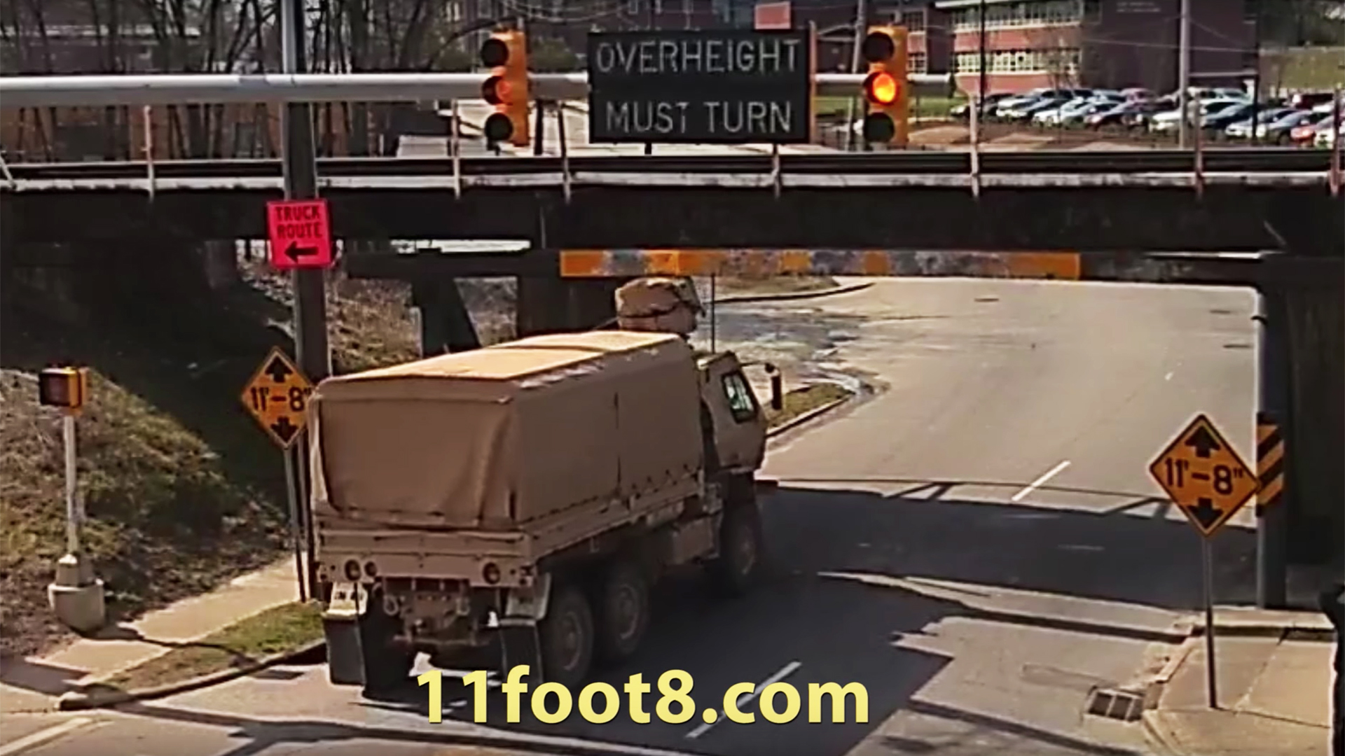 The otherwise-unremarkable 11-foot-8-inch bridge rose to prominence in recent years after a webcam was installed back in 2008 to watch for wayward trucks. Since then, 130 vehicles ranging from box trucks to RVs to, apparently, Medium Tactical Vehicles have ignored the height warnings and driven straight into the metal structure. The damage differs from detached air conditioners to destroyed roofs, but the spectacle is always fun to watch.