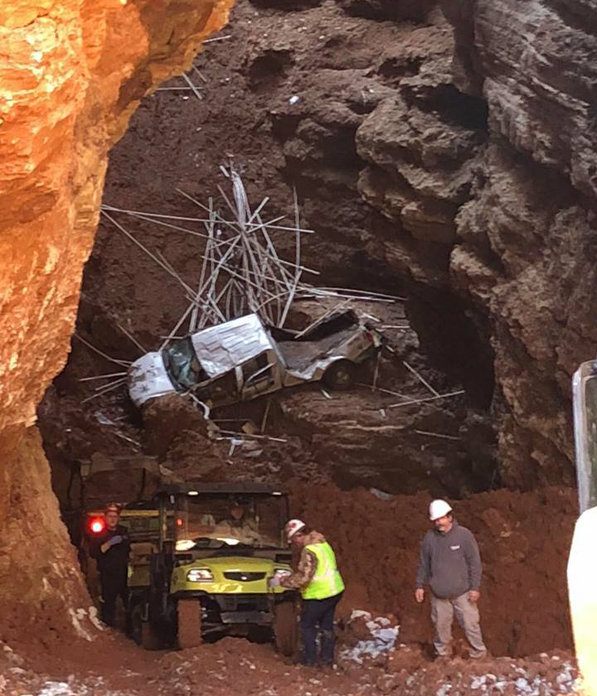 Somehow, Wynn managed to survive the fall with serious injuries despite not wearing a seatbelt and being ejected from the cab on impact. Rescuers used another construction road to approach the truck’s resting place and transported him to the surface on a Kubota UTV outfitted as a miniature, all-terrain ambulance. He remains hospitalized in Springfield, Missouri.