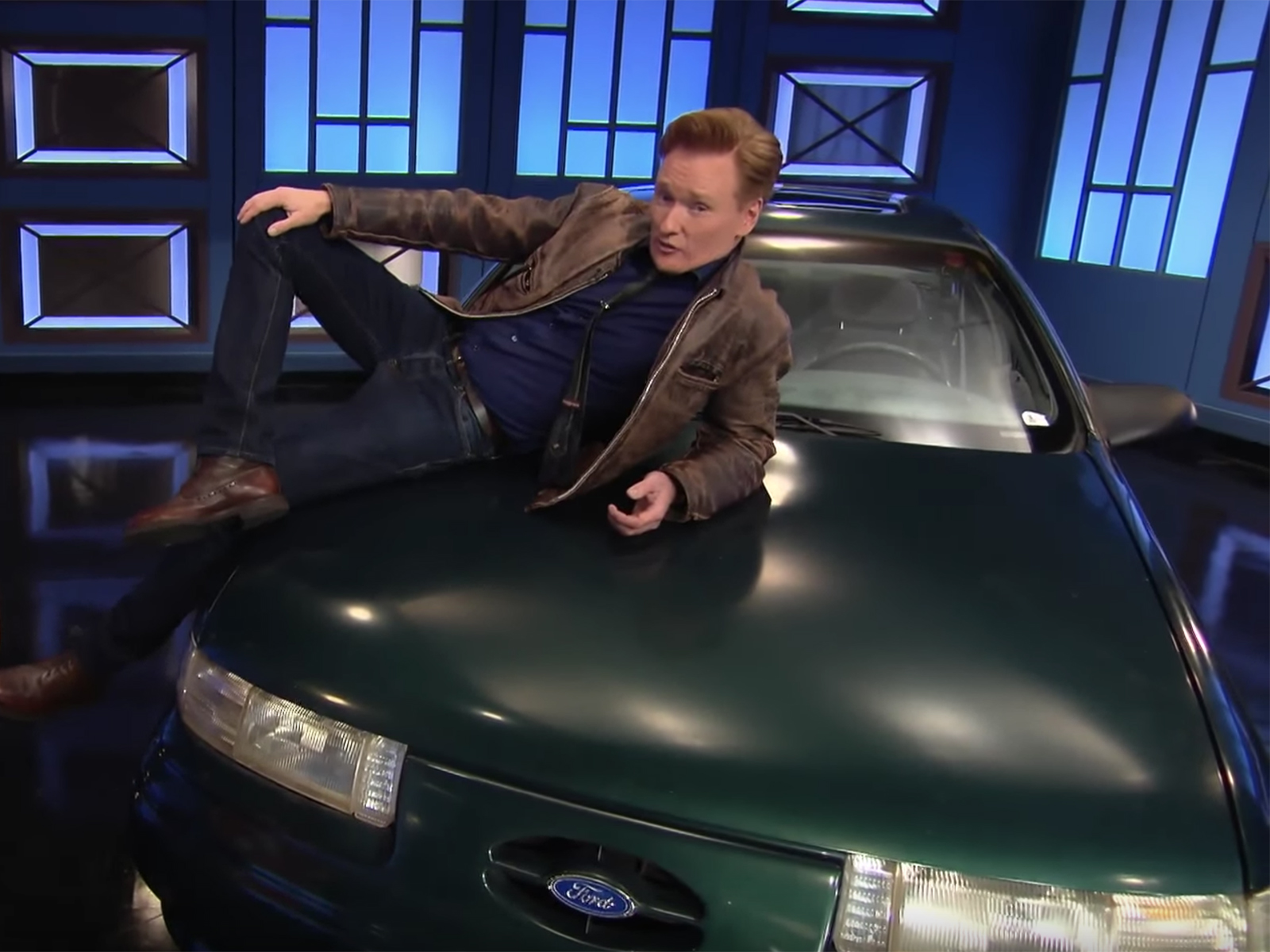 In a new skit on his eponymous talk show, Conan pulls the Taurus into the studio and extolls its greatness as an unlucky State Farm insurance agent attempts to appraise the 26-year-old car. It’s pretty tongue-in-cheek; he sarcastically notes his policy of leaving everything original, including the bald tires, and he explains away a long scratch along the driver’s side by saying that he tried to beat a toll booth gate and failed. A ding on the other side is purportedly from hitting Sean Hayes as the Will & Grace actor rode his bike around town.
