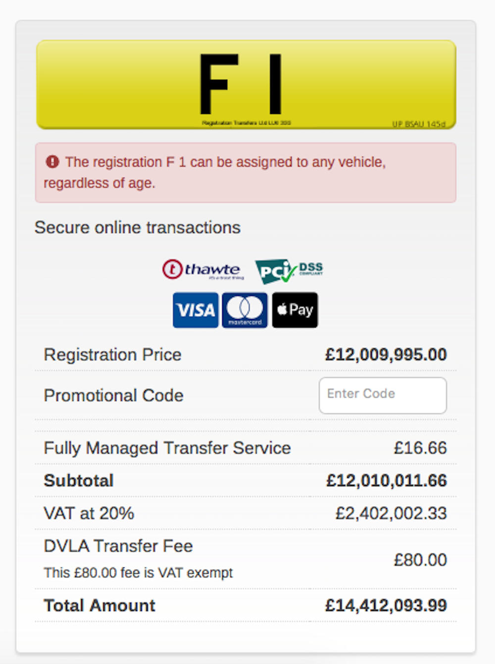Unlike in the United States, citizens of the United Kingdom own their license plates and their contents, which means that if you’re able to secure a saucy message on it, it’s yours to keep and resell as long as you pay the one-time and yearly fees. The price of the plate itself is “only” $16,96,918 or so, but after transfer fees and a whopping 20 percent tax-equivalent surcharge, the total price of admission for the plate’s future owner blows up to little over $20 million dollars.
