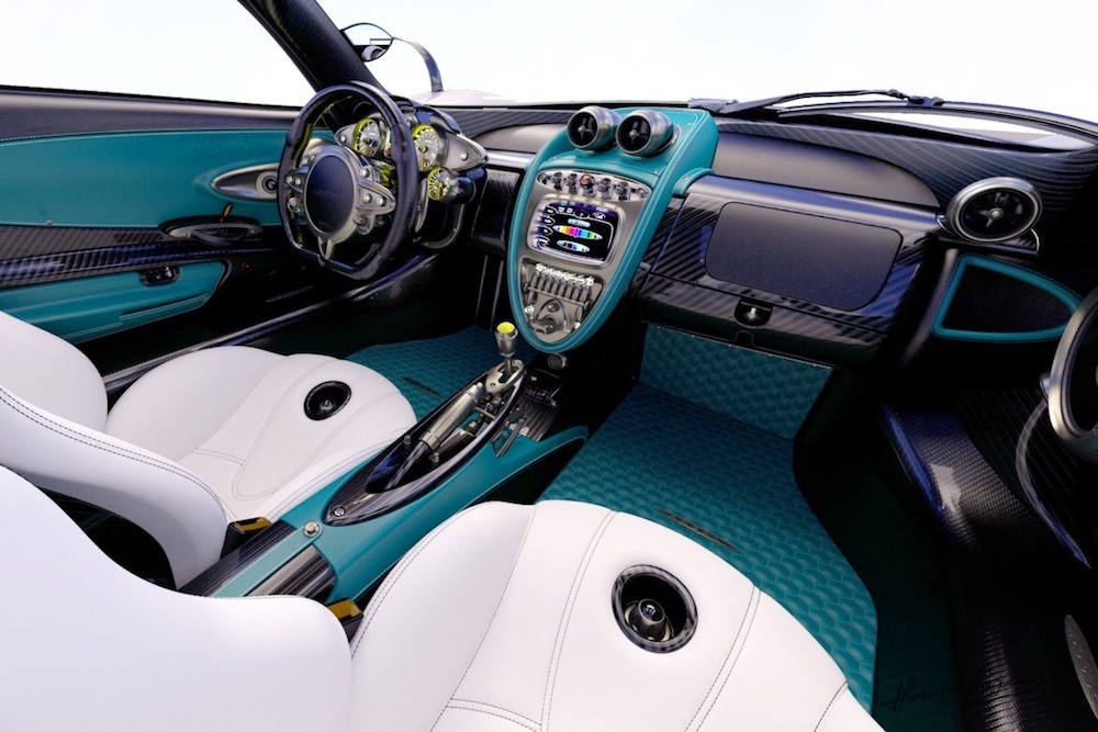 The interior is dominated by more “Petronas turquoise” accents on the door panels, center stack, and flooring, while white leather seats break through the rest of the darker colors to become the focal point of the cabin. As with all Pagani vehicles, including the Zonda, the plethora of milled-aluminum hardware used for buttons, levers, and switches is simply mindblowing.