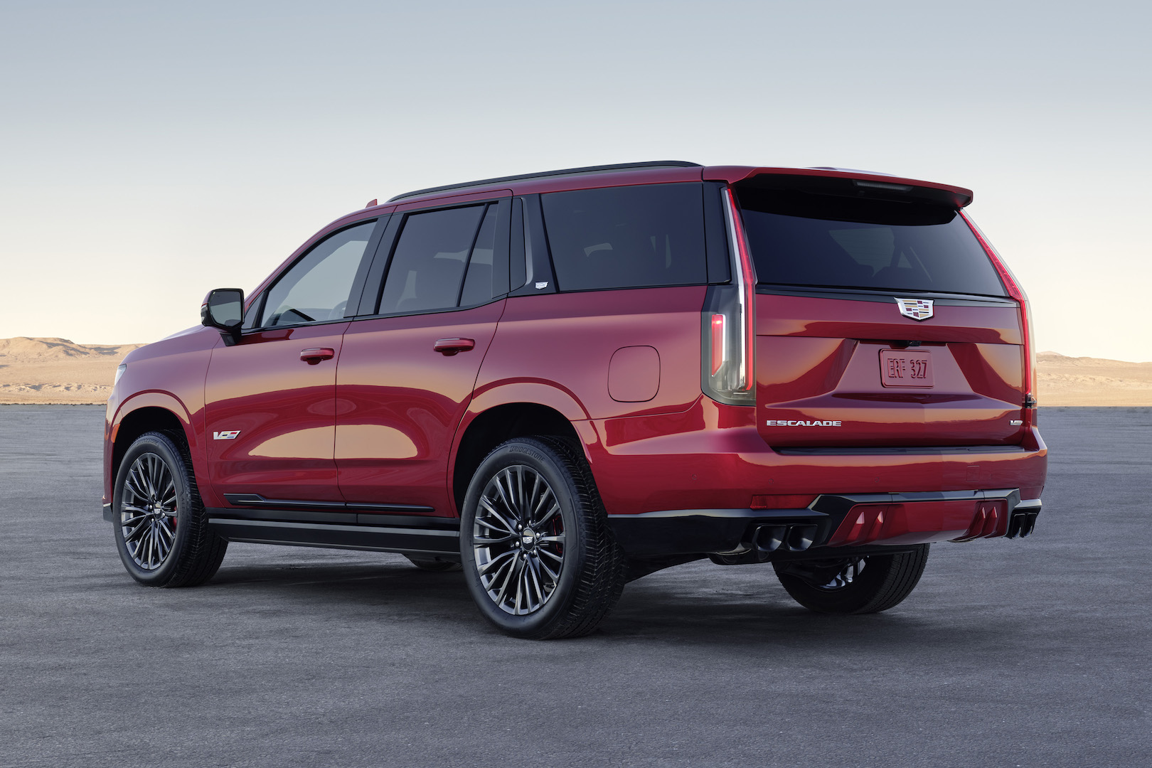 It can be adjusted with the V’s various driving modes, one of them an exclusive V-Mode, with individual settings for almost every aspect of the vehicle. Brake and steering feel, throttle and AWD calibration, exhaust valve settings, and suspension can all be personalized by the driver, who can lower the suspension 0.8 inches to make its 22-inch aluminum wheels (no steelies here) fully occupy the fenders. They and unique front and rear ends, with a splitter and quad exhaust tips, guarantee there’s no mistaking the V for a plebeian, lesser Escalade.