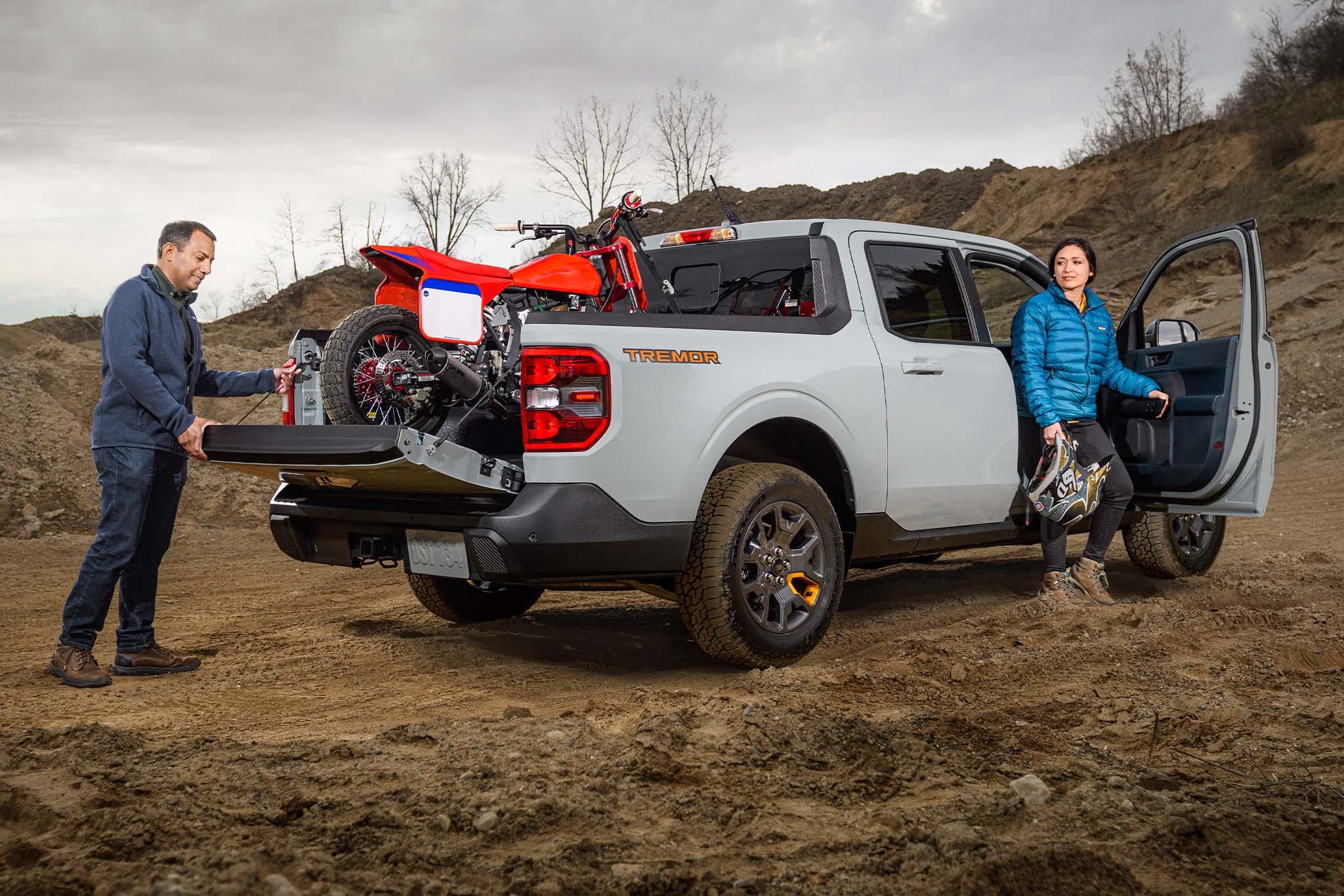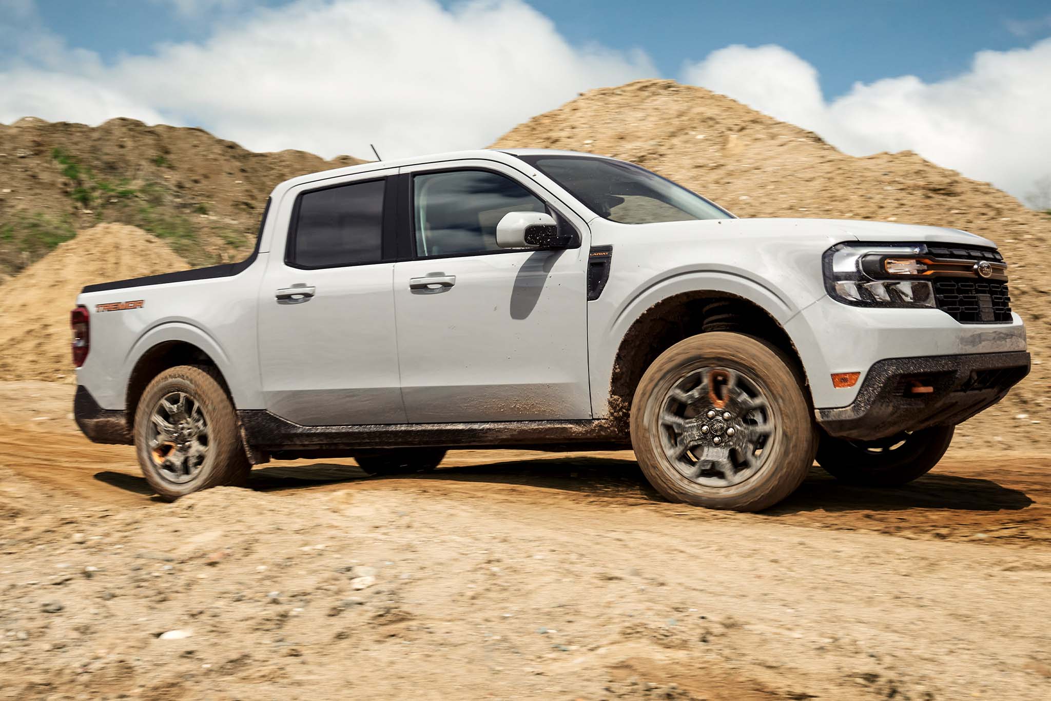 If you were worried about the 2023 Ford Maverick’s off-road cred, well, try the Tremor package on for size. It doesn’t turn the unibody truck into a rock crawler or a mud bogger, but it does make it more capable on dirt than the normal FX4 package. It includes a 1-inch suspension lift, 29-inch Falken Wildpeak A/T tires, and what Ford is calling 4WD Lock, which ought to be enough for anyone who just wants to venture into the woods without hauling much extra gear.