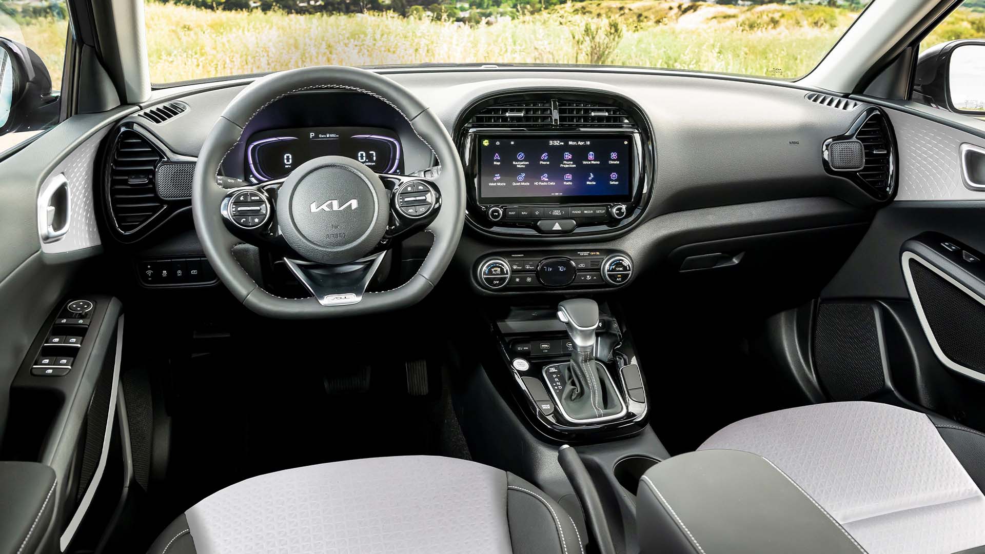 Kia released photos of the 2023 Soul in Surf Blue with a Fusion Black roof, but another two-tone scheme is also available: Clear White with the dark roof. If you’d rather have an orange or green Kia Soul, that can also be arranged. Regardless of which color you pick, do your part and make sure it’s actually a color instead of some boring shade.