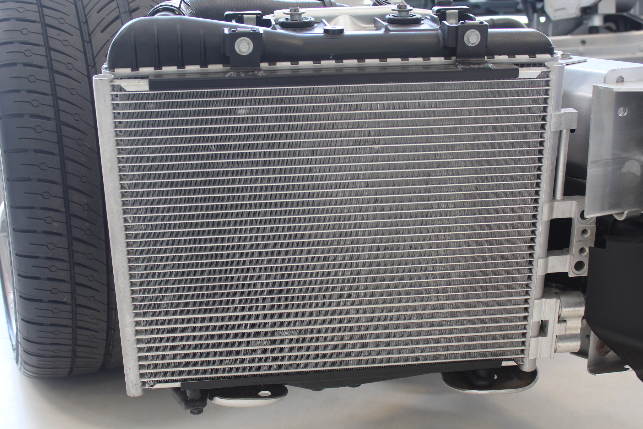 Below, you’ll notice the actual cooling channels in the heat exchanger get thicker towards the bottom. This is a separate water-glycol loop that cools almost everything to do with the electric drivetrain. The top portion with thinner channels is the AC condenser.