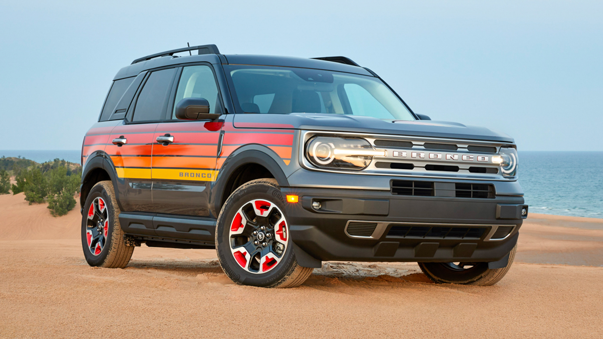 Like the originals, the Bronco Sport Free Wheeling edition has red, orange, and yellow stripes down its side, on its hood, and on its tailgate. It also gets gloss black and red wheels, a new silver grille finish, and matching patterns on the seats. The Free Wheeling package is purely aesthetic, with no mechanical changes to the baby Bronco, but it’s a very fun one that accurately reimagines a classic theme.
