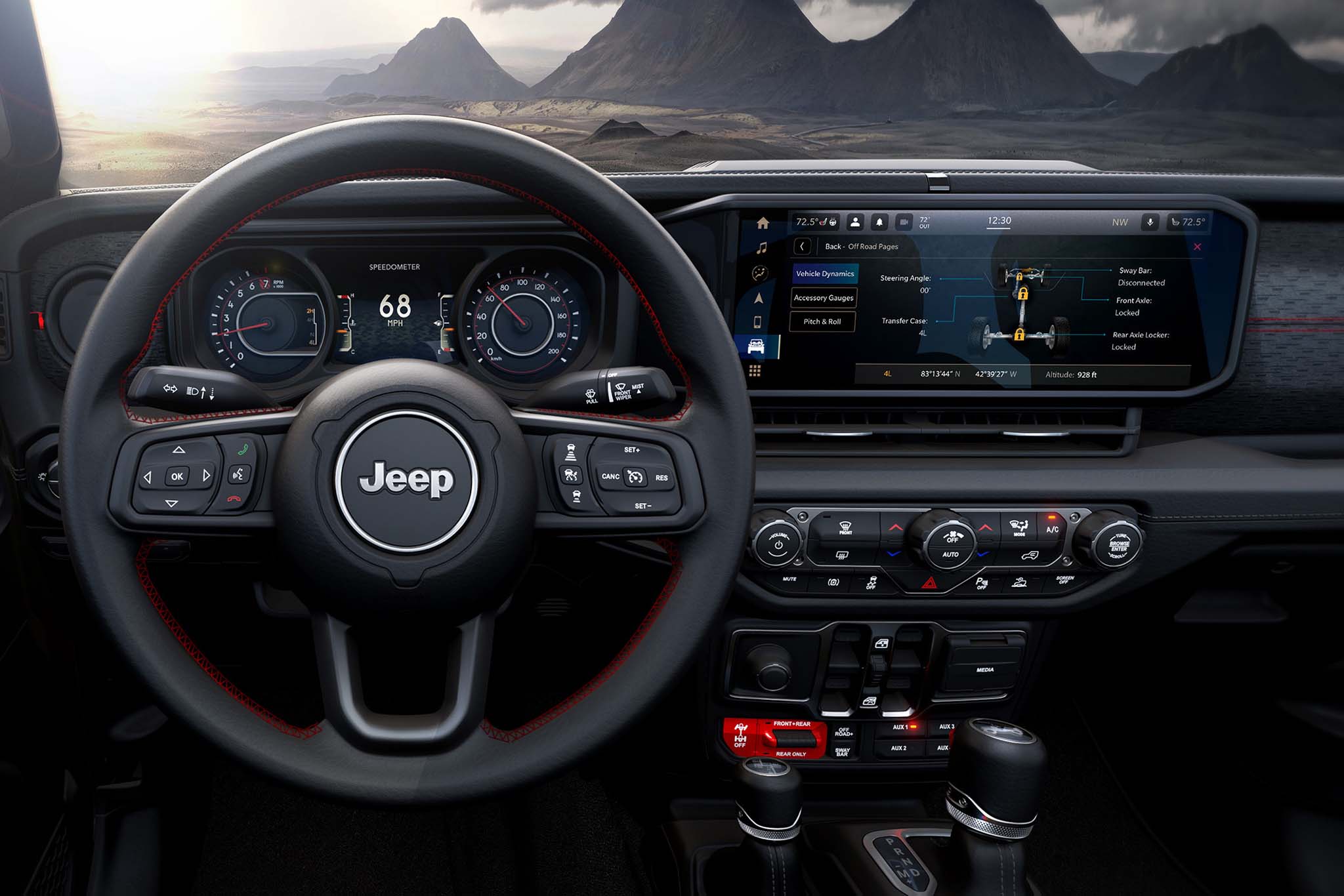Importantly, this refresh means that many of the Wrangler’s best safety features are available on all trims. First- and second-row side-curtain airbags are now a given, and every model from the Sport S on up gets forward collision warning and adaptive cruise control. Blind-spot and cross-path detection is standard on High Altitude, Rubicon X, and Rubicon 392, though you can also spec your Sport S, Willys, Sahara, and Rubicon with the assists as well.