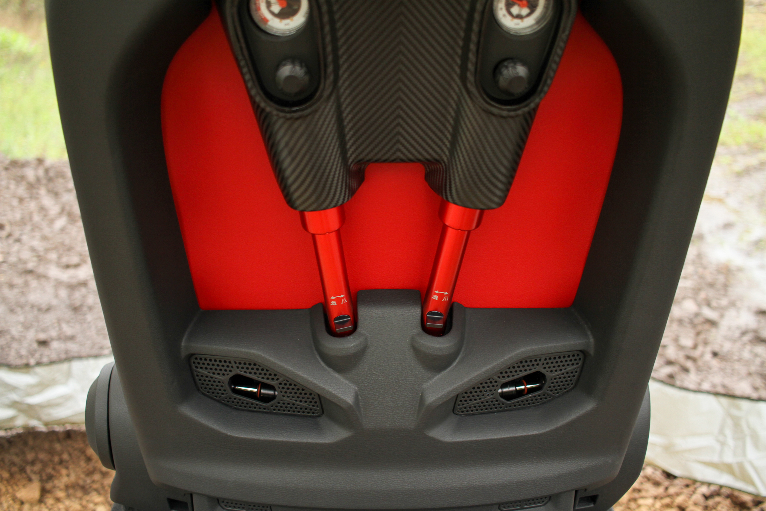 “You can see how much lateral or vertical displacement you had and then you can adjust the damping force either up or down by increasing or reducing the pressure. Let’s just say you’re mostly going to be out on the street most of the week and you’re driving to work and you don’t necessarily want to have the dynamic seat working, you simply turn these 90 degrees and you lock out the vertical and horizontal, it acts just like a regular seat. The seat has got every amenity that the high-level trims do including ventilation, heat, power, fore, aft, up, down—the only thing that we changed here is we do have a manual recline.”