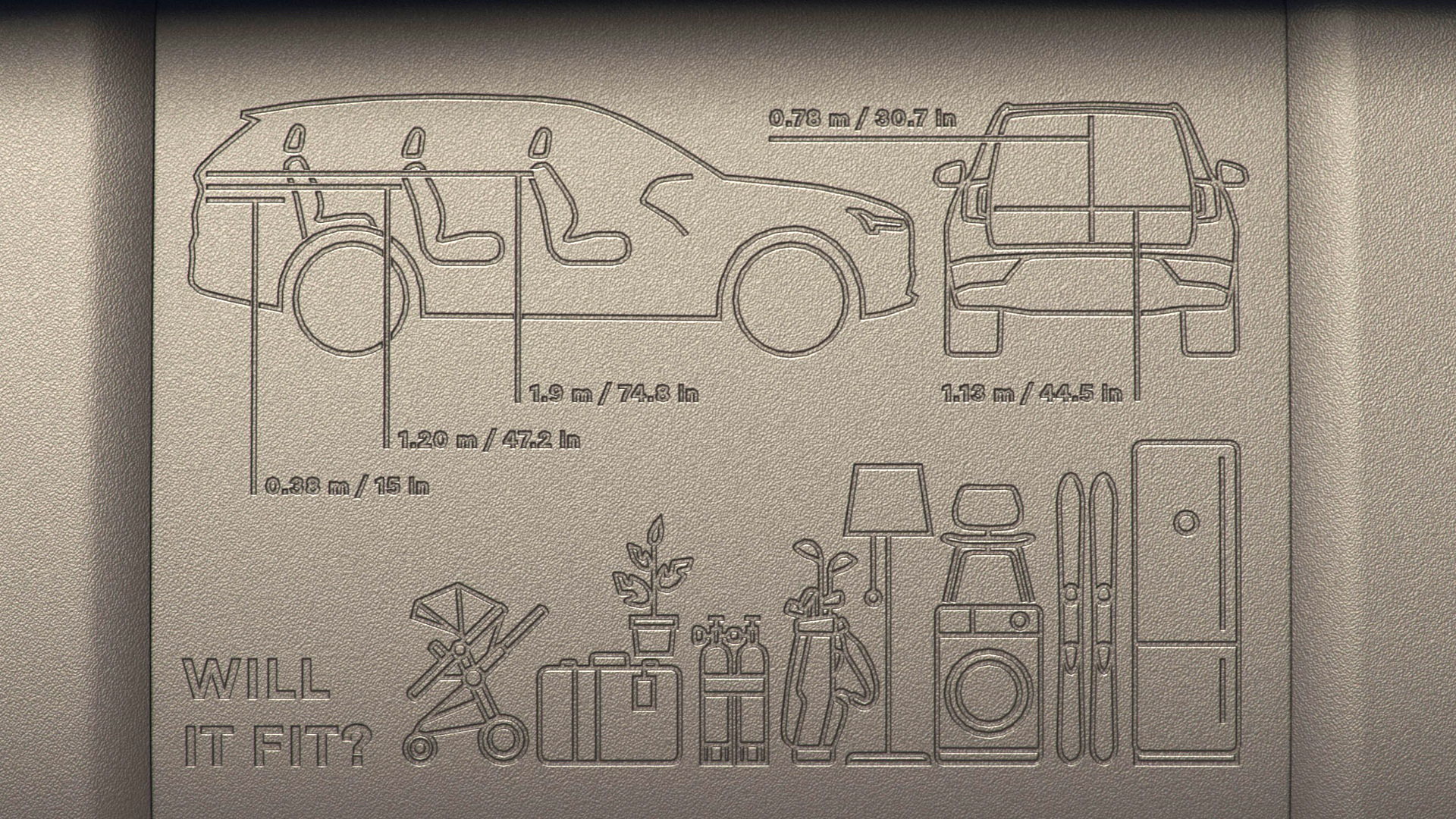The 7-seater EV SUV features an embossed graphic on a plastic molding, outlining just how much space is available in the back. It indicates the width, height, and depth of the cargo area in various configurations. It helps remove ambiguity about what will and won’t fit, making jobs like moving furniture or other items a breeze.