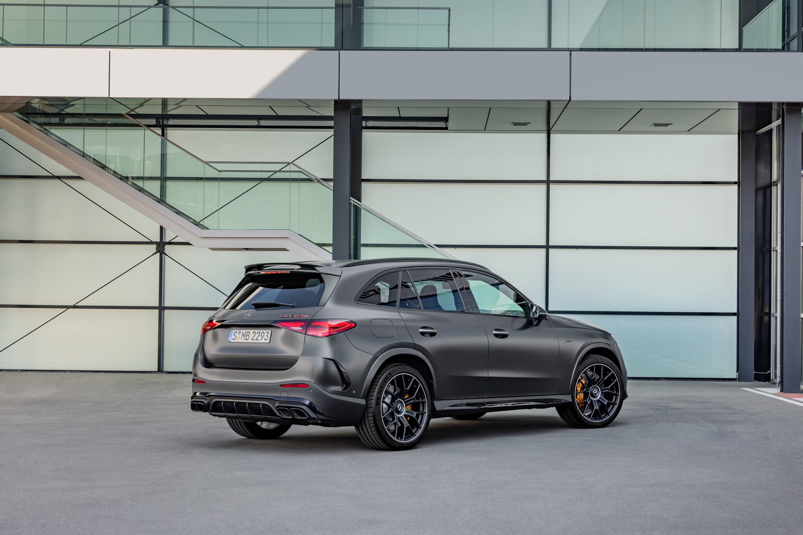 Both AMG models get steel spring suspensions with adaptive dampers, variable-ratio steering, and rear-wheel steer. However, only the GLC63 E Performance gets active anti-roll bars.