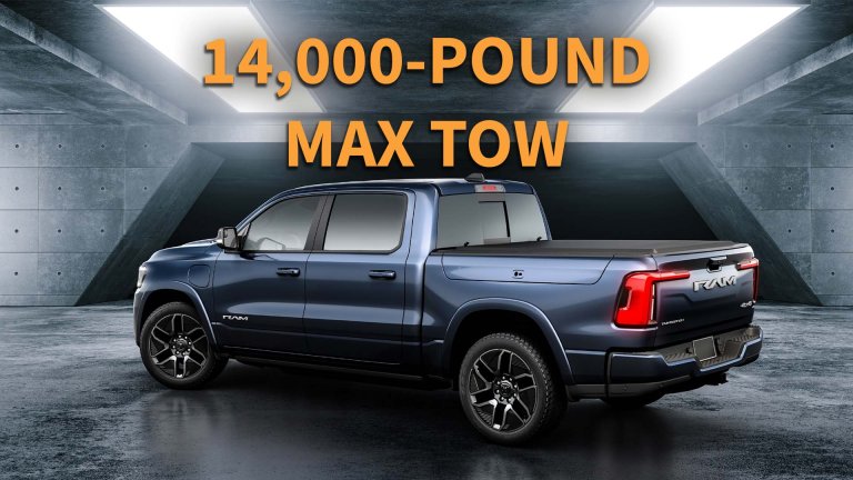 There’s another big change for the Cummins: the old six-speed automatic is out. The diesel now mates up to a new, higher-output version of the ZF TorqueFlite eight-speed automatic used in the gas model. Ram’s engineers say the shorter low gears offer more torque to the wheels taking off, while the taller high gears reduce RPMs at cruise by 25%.
