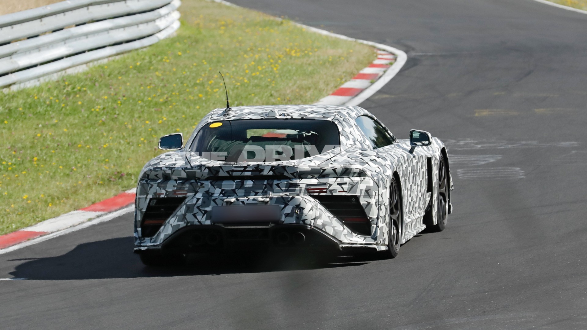 When we first saw the Sport Concept, the teaser video included some aerial “footage” of a rendered prototype with an odd element lurking beneath its rear glass. It looked conspicuously like an engine cover, but given the prevailing rumors that the LFR would be a traditional front-engine coupe based on an ICE powertrain, I wrote it off. Well, turns out it was something after all, and Lexus was having trouble keeping it covered while it was lapping the ‘Ring.