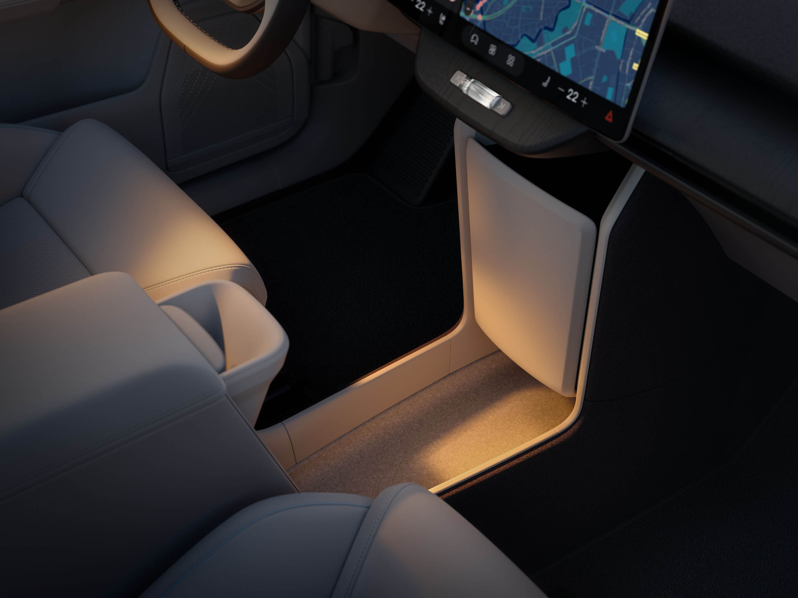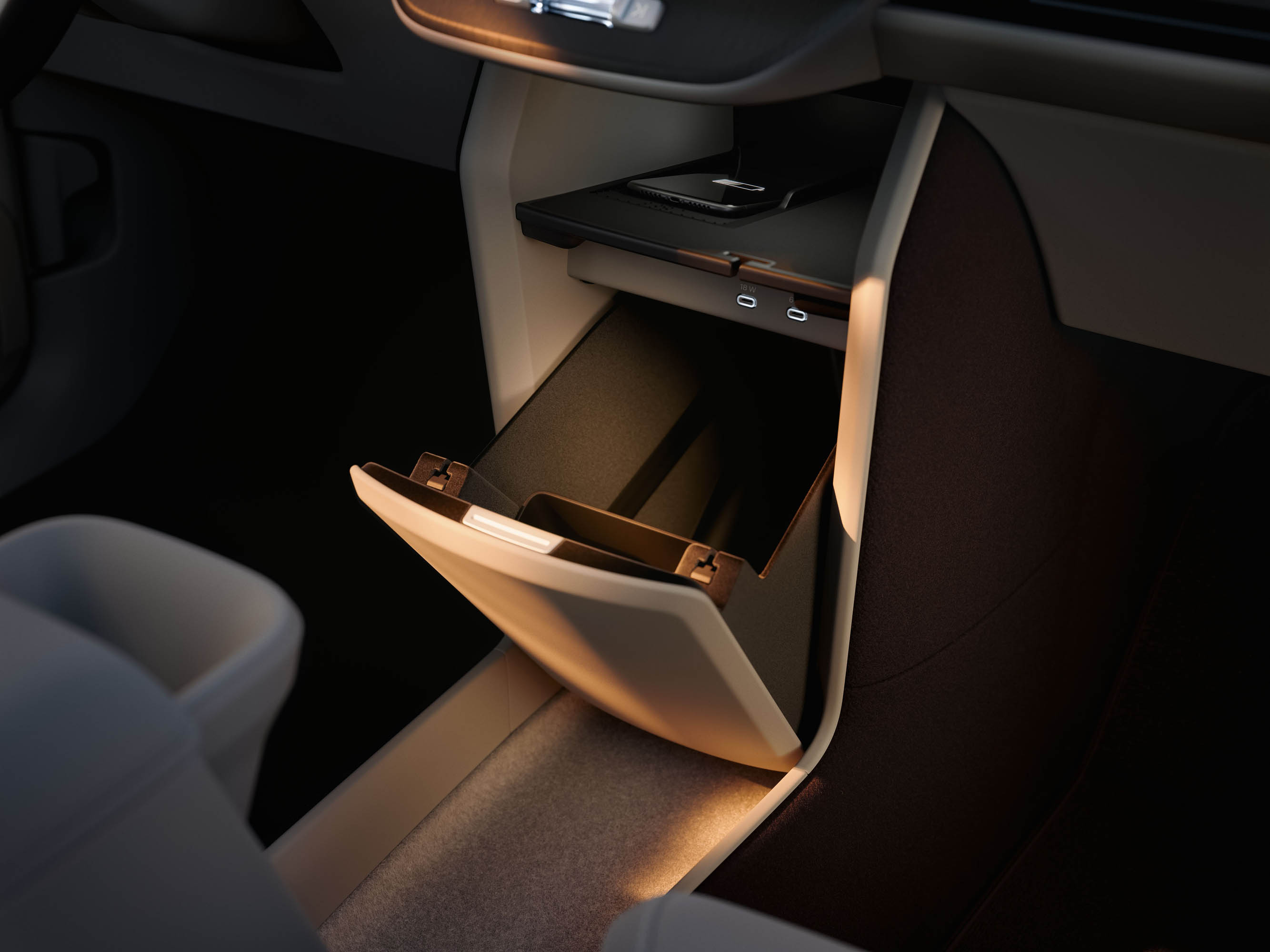 Inside the design is more revolution than the exterior’s evolution. The dashboard cribs from the Tesla, Lucid, and Volkswagen playbook, but a Volvo spokesperson told The Drive, “we learn” noting the EX60’s pressable and backlight buttons and knobs on the steering wheel. A horizontal two-tier stacked dashboard does away with the center console entirely. A Tesla-like 15-inch horizontal touchscreen houses most vehicle controls, but a crystal-looking volume roller sits below the touchscreen augmented by track forward and back buttons on either side. Both Apple CarPlay and Android Auto wireless smartphone projection will be standard, though the latter will arrive late via an over-the-air software update. The EX60 will be the first Volvo to have native Apple Music with Dolby Atmos. An 11.4-inch digital gauge cluster sits atop the dashboard in front of the driver unlike in a Tesla similar to that of a Ford Mustang Mach-E. The squircle steering wheel, just like what’s found in the Lucid Gravity, ensures the digital gauge cluster isn’t obstructed and features real buttons that are pressable and backlit, according to a Volvo spokesperson. The air vents are mostly hidden on the dashboard and integrated into a horizontal line controlled by the touchscreen, like in a Tesla or a Rivian. The center console and front center lower portion of the dashboard both feature slide-out and flip-out storage compartments for space utilization.