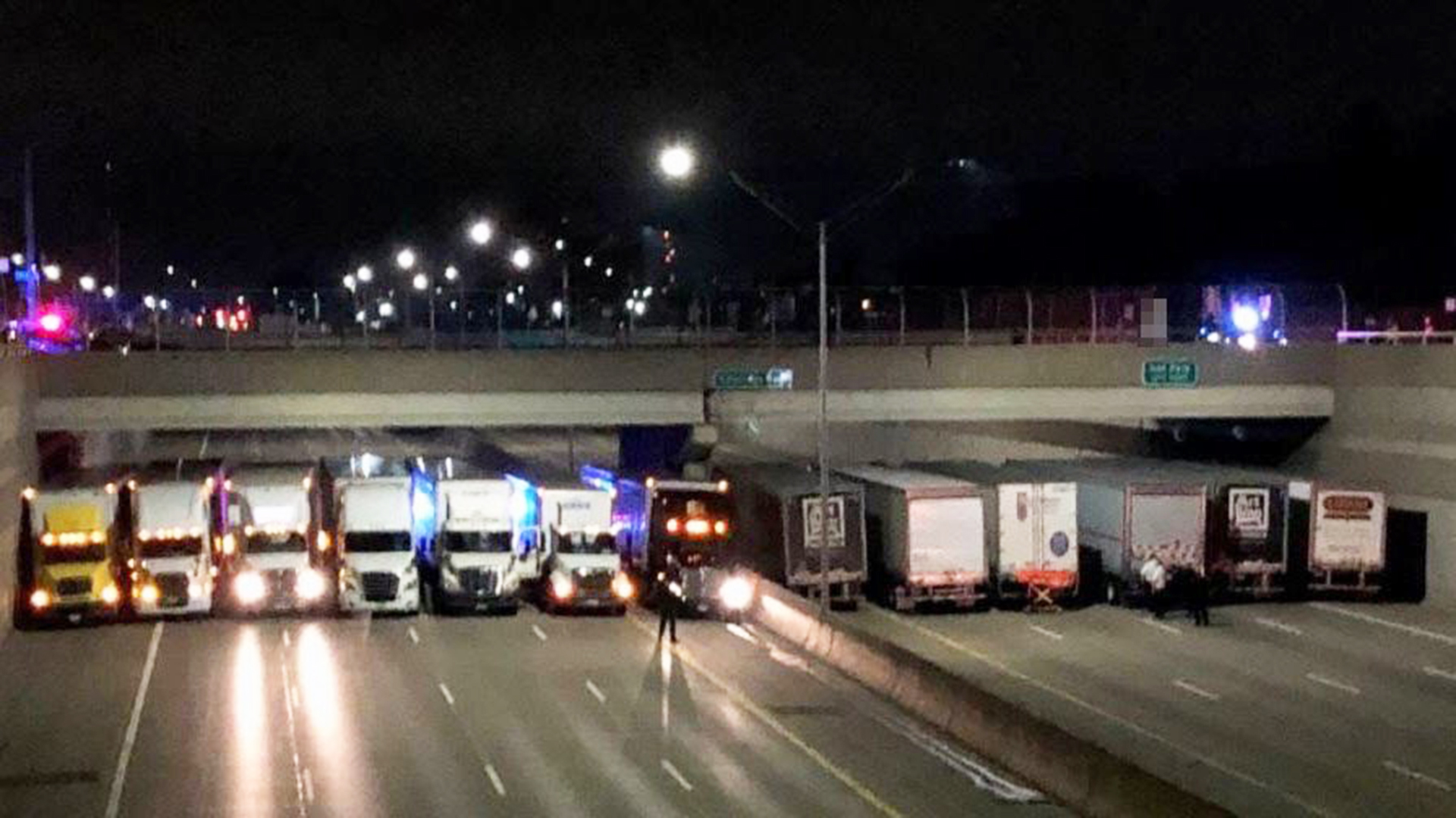 As negotiators tried to talk the man down, thirteen semi-trucks slowly filled the space below the overpass until the entire highway was blocked shoulder to shoulder. The drivers sat there for three hours until the man eventually walked off the bridge and was taken to a nearby hospital for evaluation.
