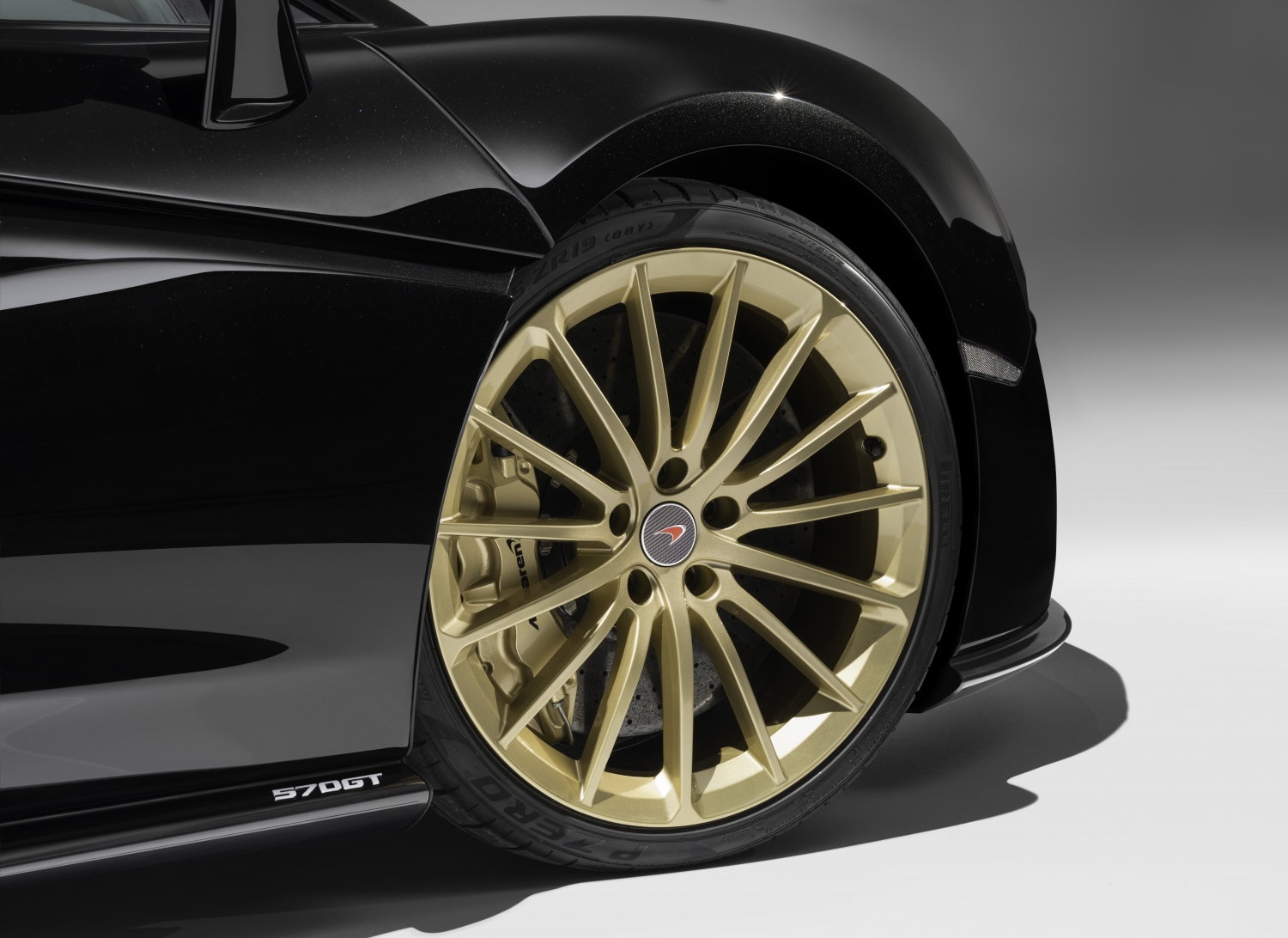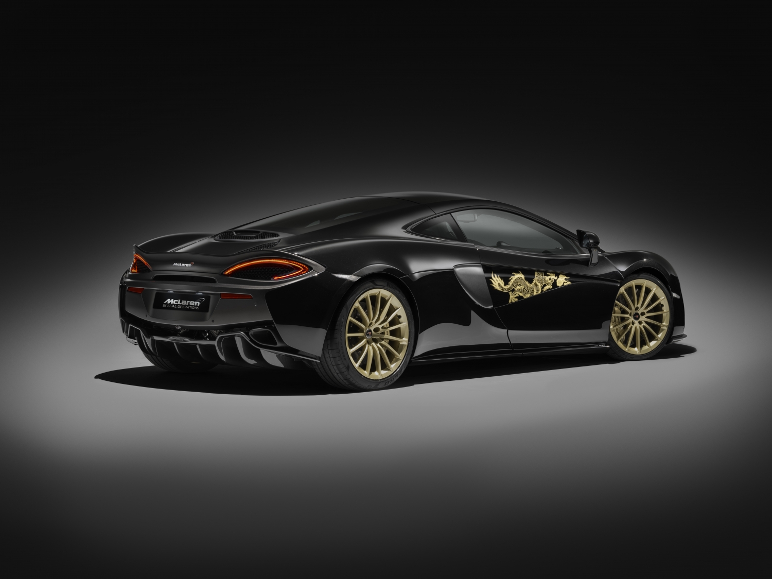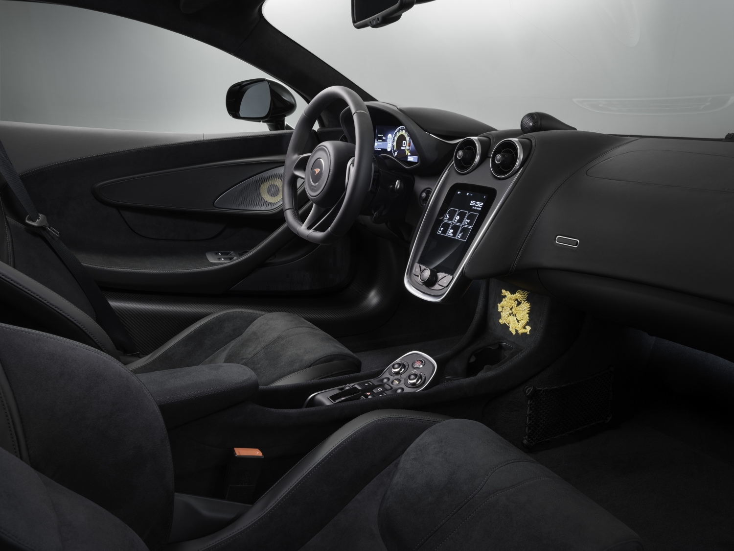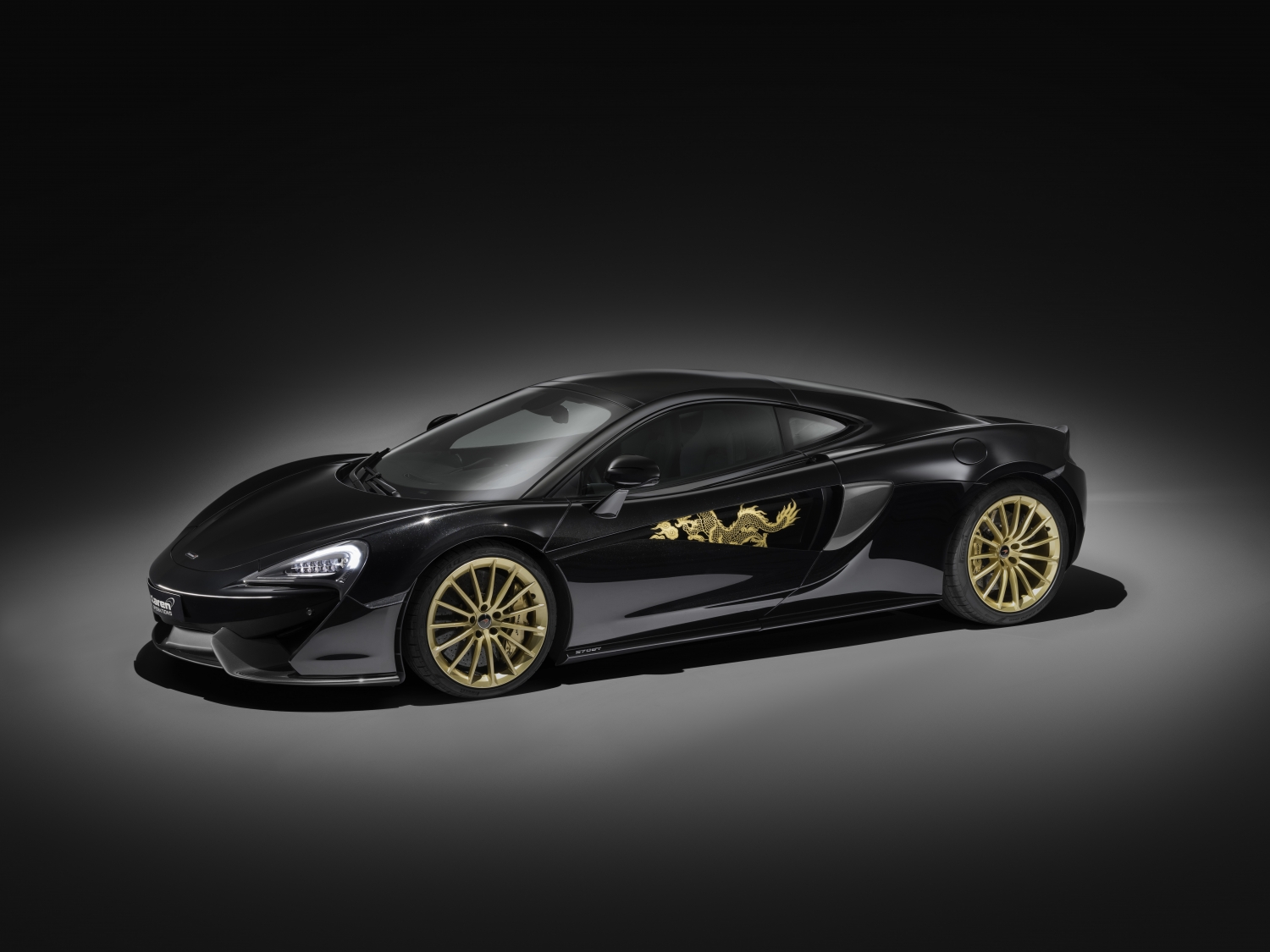Entrepreneur Mr. Cabbeen designed and commissioned five of these cars through McLaren’s bespoke arm, McLaren Special Operations. The 570GTs are themed around classic Chinese art, featuring dragons on the doors hand-painted with Gloss Speedline Gold over an MSO Bespoke Obsidian Black exterior paint. The brake calipers feature the same gold material, tucked behind unique 15-spoke wheels.