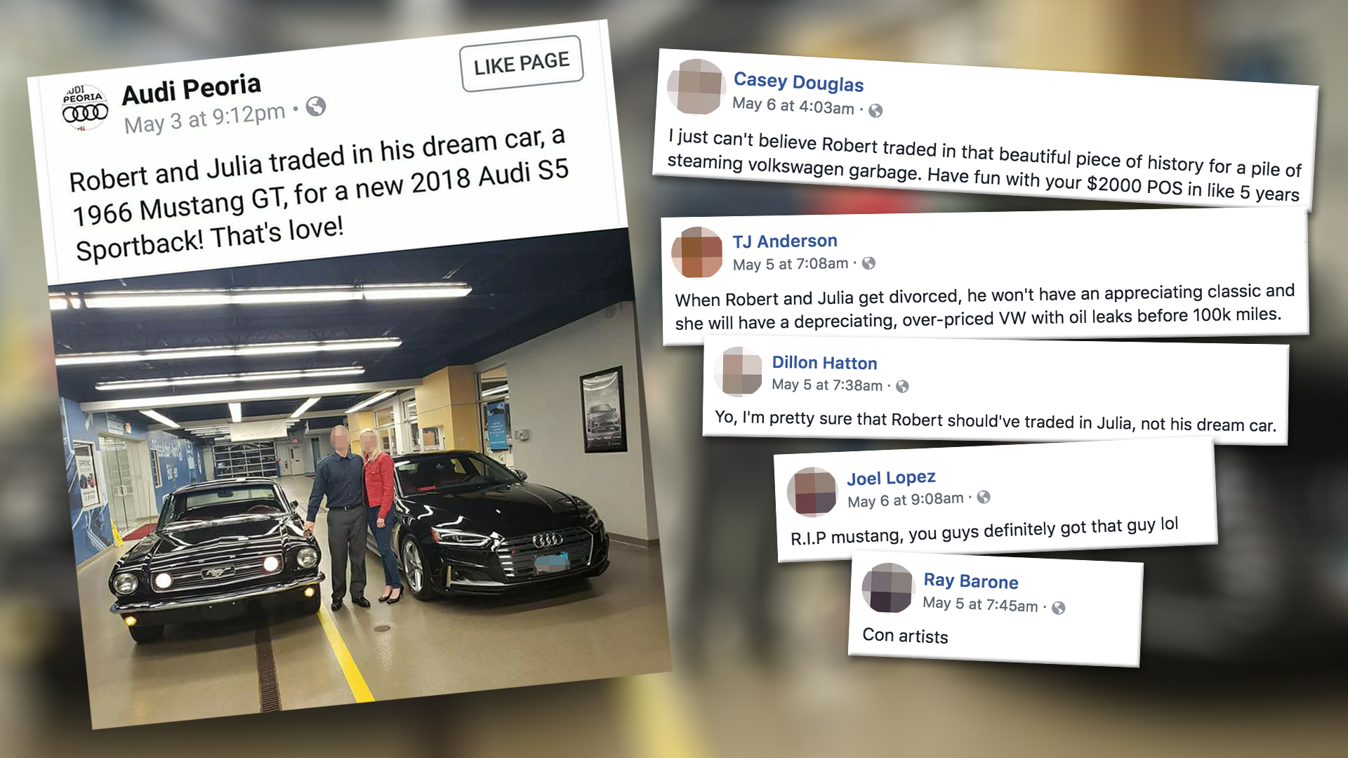 A car dealership’s Facebook page is typically a pretty innocuous space, with posts sharing information on sales, photos of happy buyers next to their new rides, and the usual mix of questionable online reviews. But on May 3, Audi Peoria unintentionally shattered that peace when it shared this picture of a smiling couple identified only as Robert and Julia standing between his beautiful classic car and S5 Sportback after making the switch.