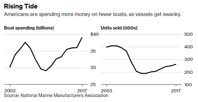 Bloomberg made a useful chart using data from the National Marine Manufacturers Association illustrating boat unit sales making a slow recovery since the recession, but boat spending reaching record highs. The data suggest that fewer people are buying boats, but the people who are buying boats are spending a lot more money on them than buyers used to. This could be part of the reason Polaris was interested in buying Boat Holdings, which carries the high-end Bennington brand that’s been pushing pontoon boats further upmarket.