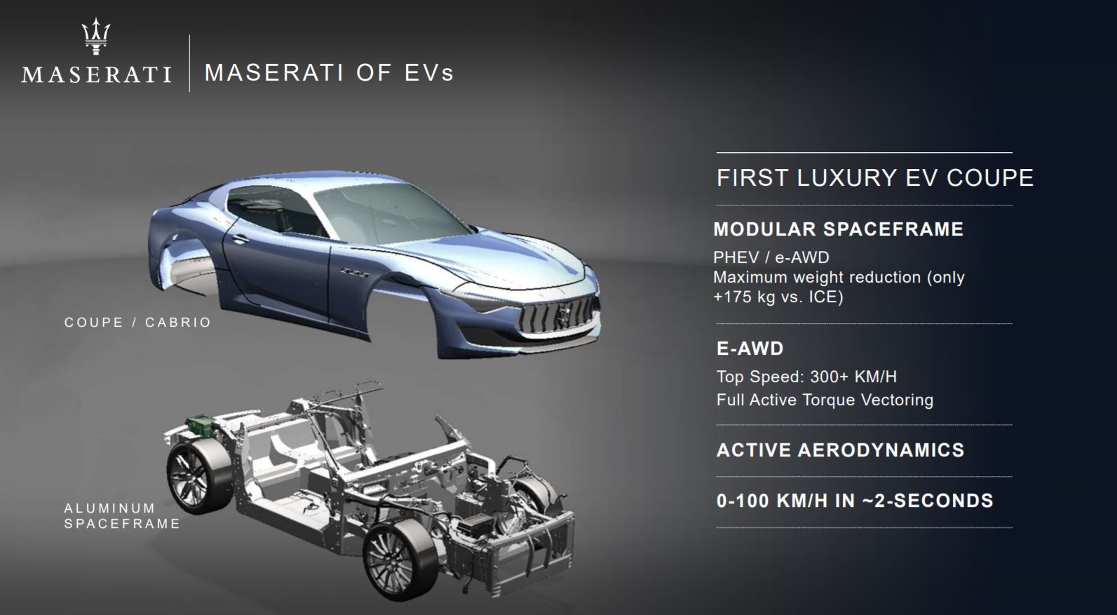 Maserati says it’ll be the first “luxury EV coupe” on the market. Featuring torque vectoring “e-all-wheel drive” and an aluminum spaceframe, the car will apparently reach 62 mph in around 2 seconds and boast a top speed of more than 186 mph.