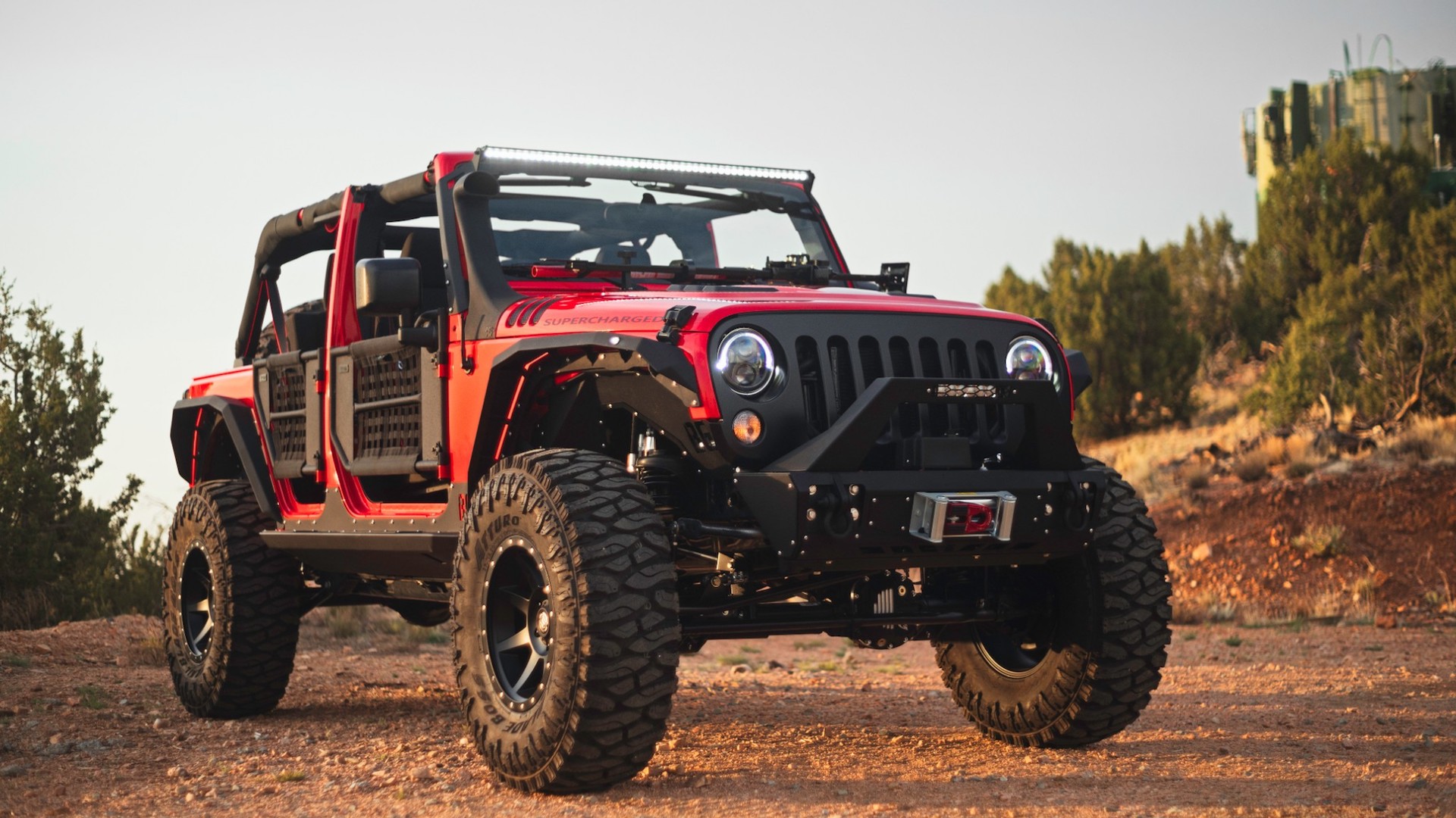 The aftermarket equipment is hefty with this one, but some of the most noteworthy tweaks took place under the hood and chassis. The original 3.6-liter Pentastar V6 received a healthy dose of oomph courtesy of an Edelbrock supercharger and a wide variety air-intake goodies from K&N Engineering, including a snorkel. The exhaust system was also overhauled with a cat-back single-exit exhaust kit courtesy of Flowmaster.