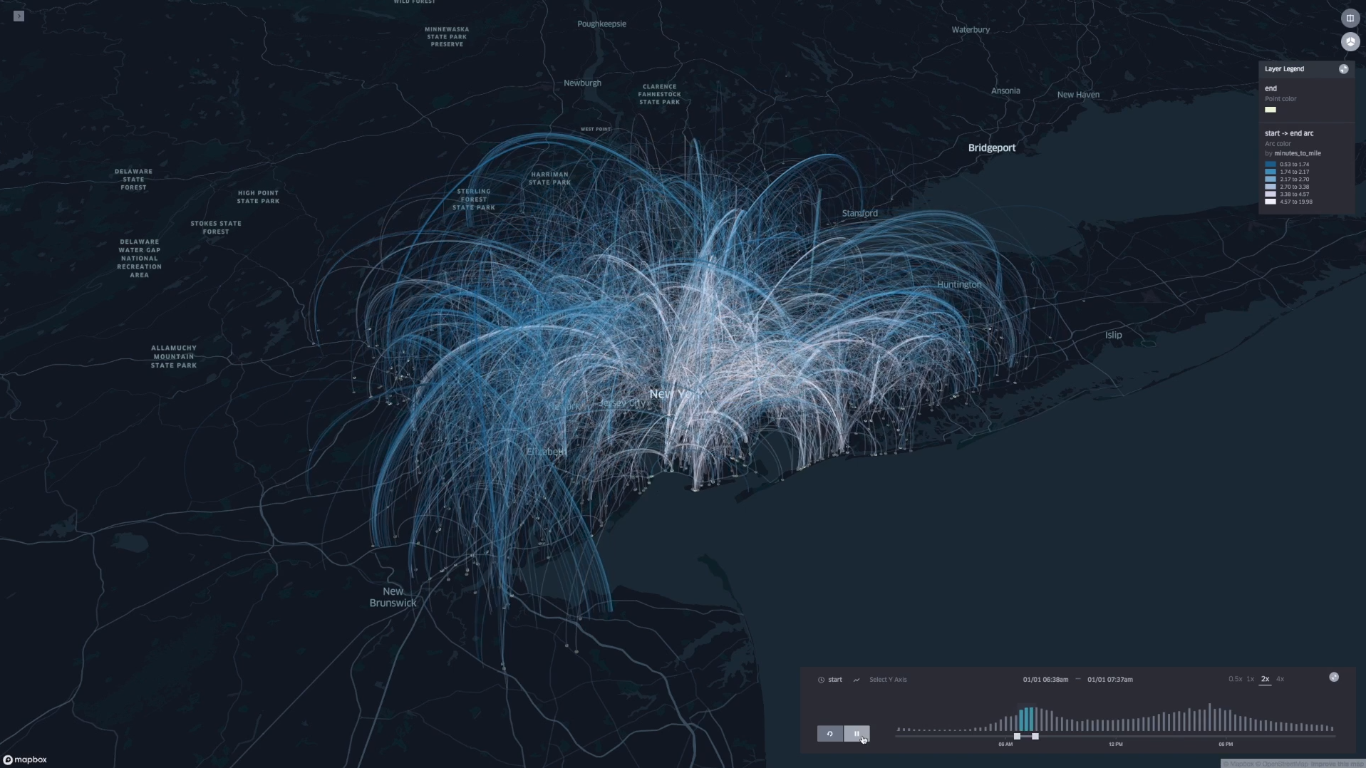 The day starts a bit earlier in Los Angeles with morning traffic peaking at 6:57 am. The traffic flow throughout the day in the City of Angels is pretty similar to that of NYC, but with higher volumes. In the video, you can see the huge area where the busiest traffic is spread out with thinner traffic going in and out of the greater metro area.
