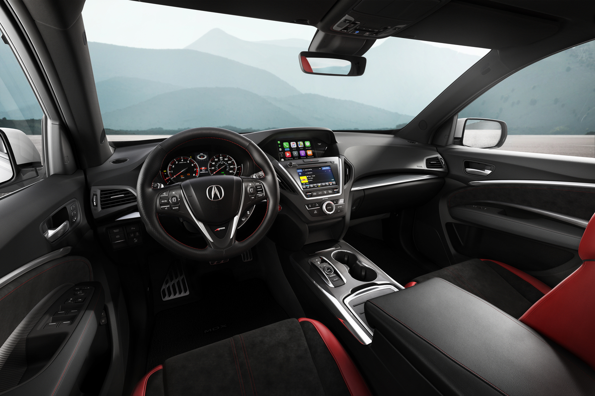 Inside, the MDX A-Spec features sports seats trimmed in red or black leather along with black Alcantara inserts, high-contrast stitching, unique A-Spec gauges, sport pedals, Alcantara door inserts, gloss-black trim, a thicker-rimmed A-Spec badged steering wheel with paddle shifters, and an exclusive A-Spec doorstep garnish.