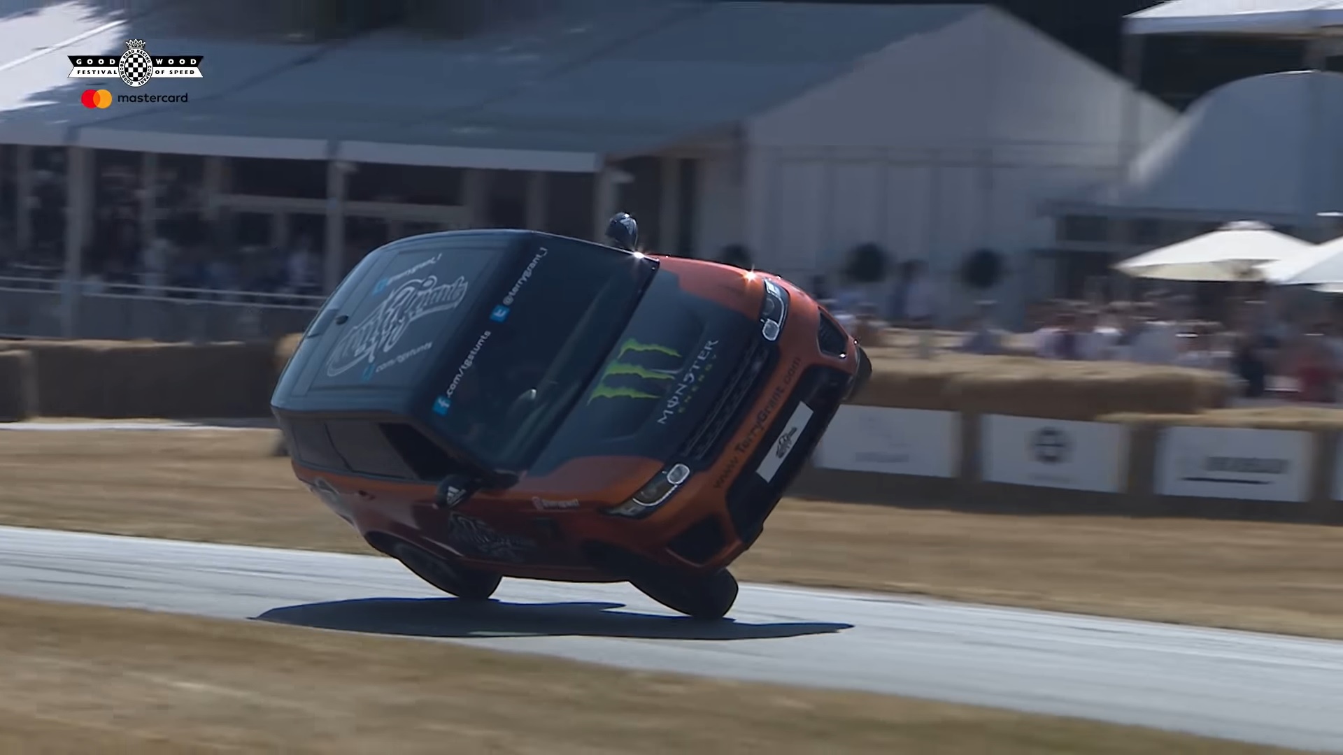 With the left side of the car sticking up in the air, Grant piloted a Range Rover Sport SVR all the way up Lord March’s 1.16-mile driveway. With a time of 2:24.5, he set a Guinness World Record for the fastest two-wheeled mile, beating the previous record of 2:55 set by himself back in 2011 in a Nissan Juke by over 30 seconds.