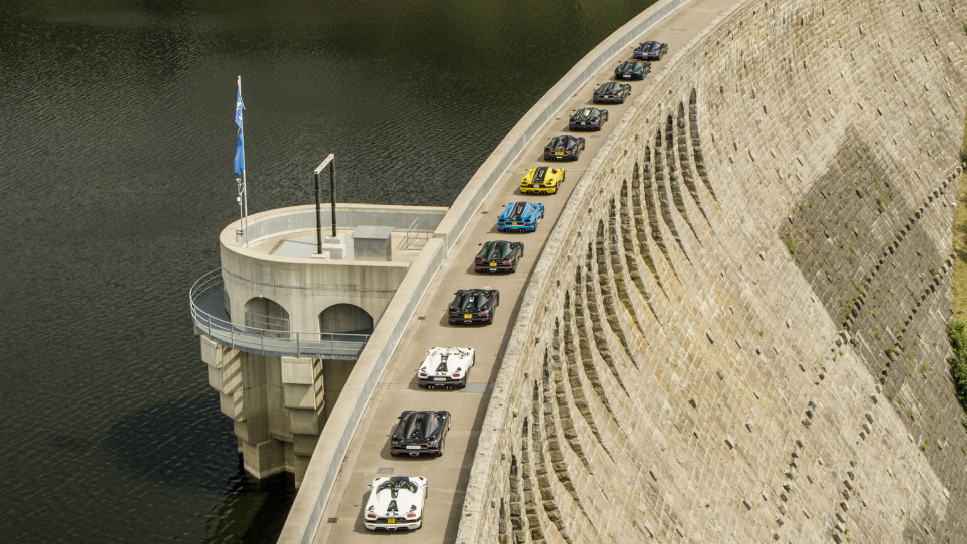 The weekend of July 6 began in Baden-Baden, Germany with Koenigsegg delivering the final Ageras built, Thor and Väder, to their new owners. On Saturday, the group made their way through the Black Forest for a hard park and picture on top of the Schwarzenbach Dam, before moving on to another town for…go-karting. Sunday saw the group head 186 miles to the village of Königseggwald, home to the Koenigsegg family residence. The trip ended 80 miles away at Parkhotel Adler, a very aerodynamic stone’s throw from Freiburg.