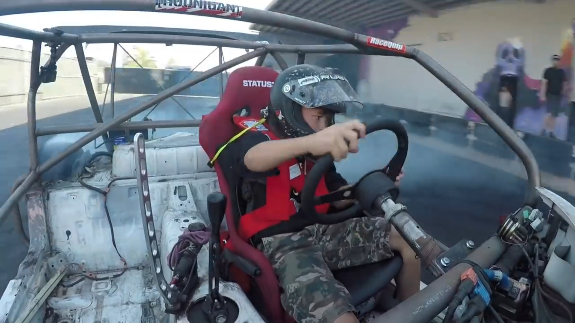 While young Yankilevich stopped by Hoonigan’s shop to film his side-by-side tomfoolery, the crew then got the bright idea to strap him into its Mad Max-style Miata known as ‘Shart Kart.’ The Drive has featured some of Hoonigan’s Shart Kart antics before, but never before with a nine-year-old.
