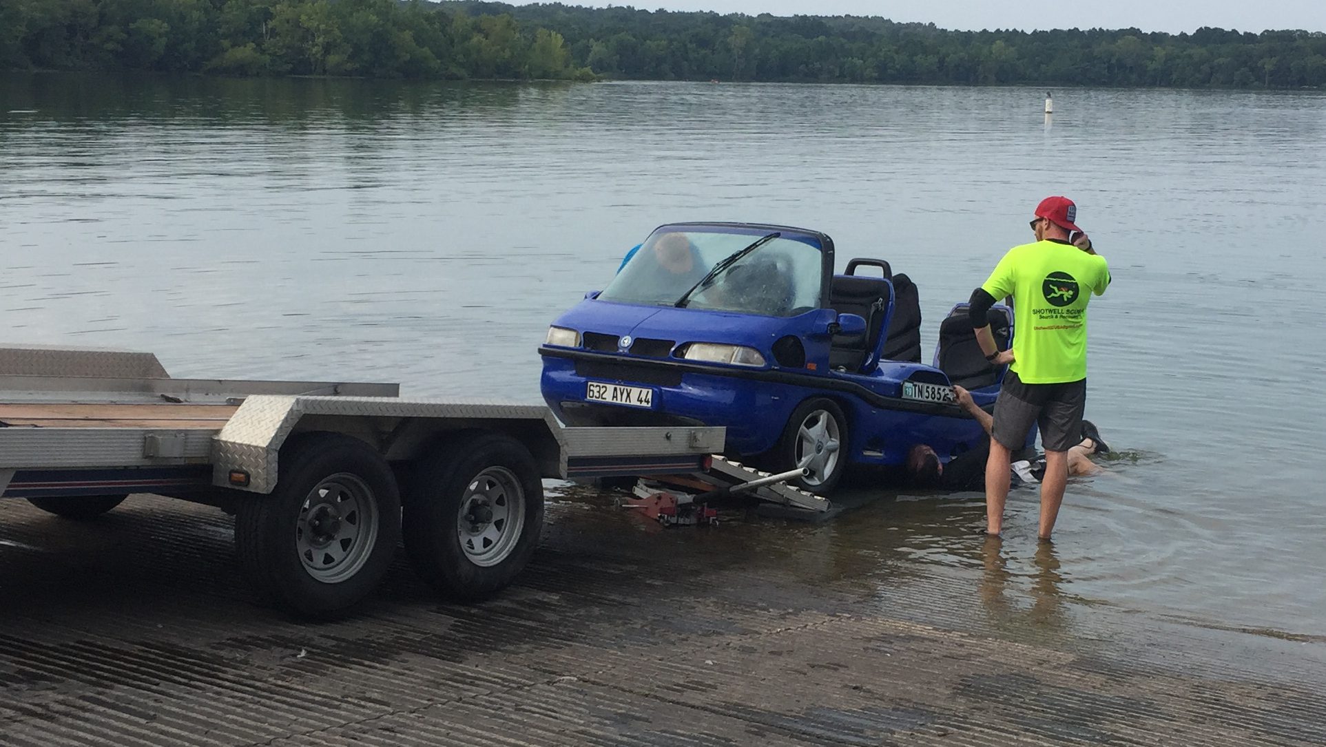 Driving the car during the incident was head of the museum, Jeff Lane. After Lane and his passengers made it to dry land, he told local news agency WPLN that he had previously taken the car on many naval voyages and this was the first time it had an issue. According to Lane, the Hobbycar had ended up about 25 feet below the surface of Percy Priest Lake.