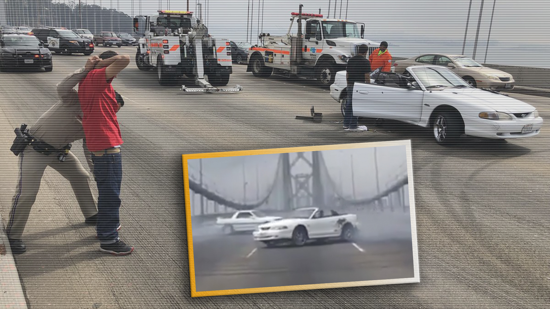 Thankfully, it does. Another video shows the white convertible SN95 Mustang eventually lose one of its rear wheels just before police arrive to provide the grand finale, arresting the driver while his two friends and their accomplices flee the scene. We don’t get to see the arrest take place, but this perfectly-framed picture provided by the CHP more than makes up for that. The driver getting booked, the Mustang still stopped in its tire tracks, the tow truck operators figuring out how to haul the hunk of junk out of the way…frame this and put it in the SFMOMA.