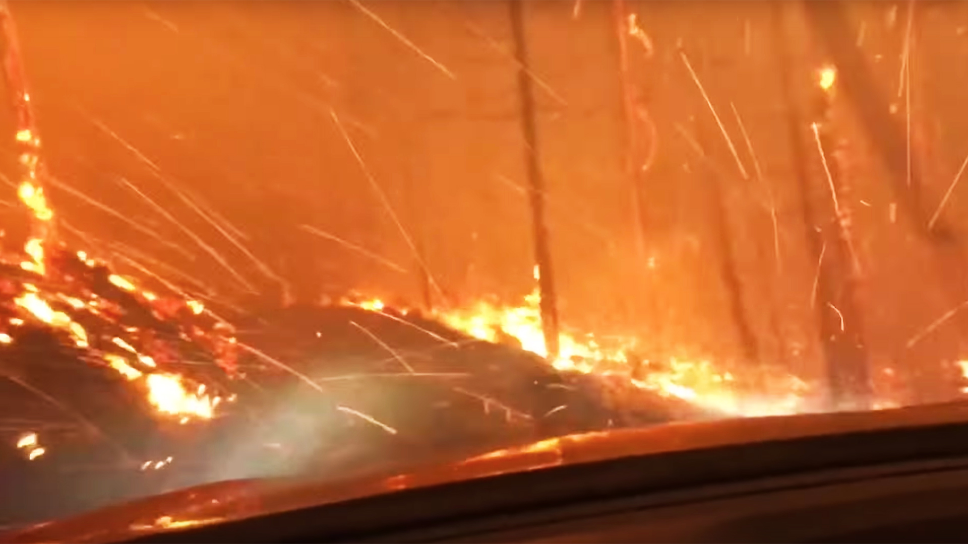 The video picks up soon after he and his father hopped into their rental Subaru Legacy to make their escape. Things immediately look grim as Bilton nervously pilots the Subaru down the trail, walls of fire glowing in nearby thickets in every direction. He asks the question that would flash through anyone’s mind in that situation: What if the car blows up? His father’s response is pitch perfect, a brief light in the darkening tunnel. Well, we’re dead. Just keep driving.