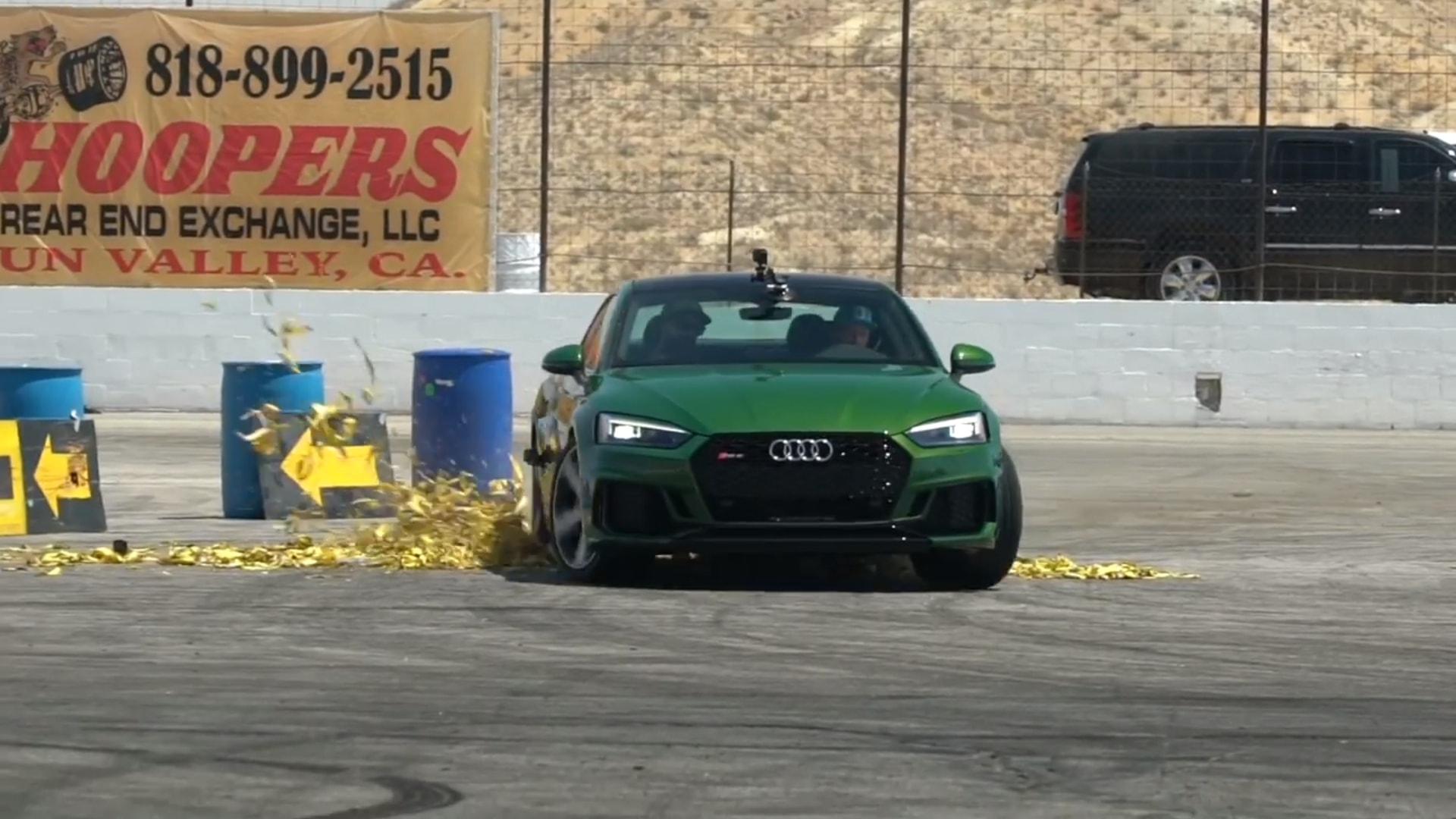 For the test, Bakkerud drove a brand new 2018 Audi RS 5. The Hoonigans set up a course for him to drive around where he set three consistent lap times, and after that, the crew decided to “banana it up” and throw peels all over one of the turns. The bananas did have an effect, but not as drastic as Mario Kart would have you to believe.