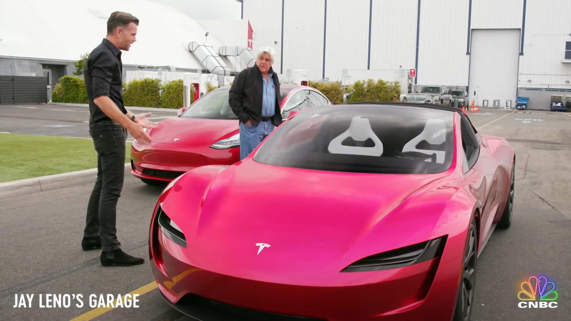 Pulling up in what is presumably his own 2008 Roadster, the Jay Leno’s Garage host discusses Tesla’s presence in the mass-market Model 3 before taking the electric sedan for a short test drive. More notably though, Leno then gets a glimpse at the brand’s future when von Holzhausen brings out the next-generation 2020 Roadster.