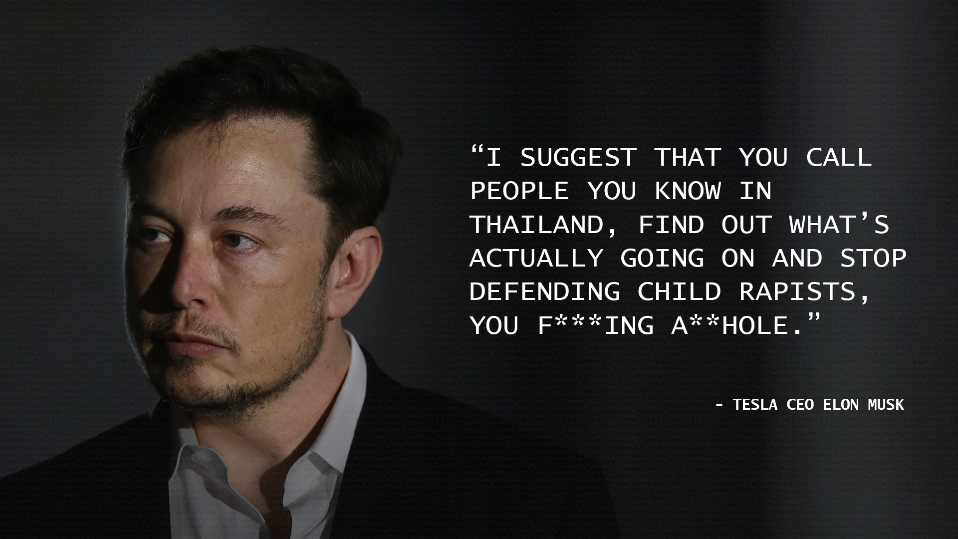 Embattled Tesla CEO Elon Musk brought his campaign against a British rescue worker and cave diver to explosive new heights on Tuesday, accusing a man who helped save a youth soccer team from a flooded cave in Thailand of being a “child rapist,” alleging without evidence that he married a 12-year-old “child bride,” and calling a reporter a “f***ing a**hole” in a bizarre email exchange posted on Buzzfeed News.