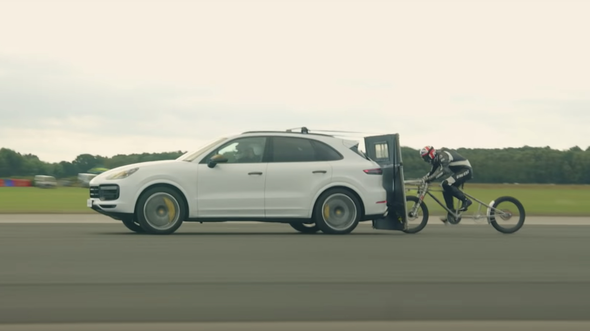 The slipstream is the area behind a moving object where the velocity of air is similar to that of the moving object. You can routinely see drivers take advantage of this physics phenomenon during Formula 1 races, for example. In this instance, having the Porsche Cayenne Turbo tow Campbell on his bicycle allowed him to release the bike once the vehicles reached 110 mph, and then use the slipstream to pedal his bike up to 149.16 mph.