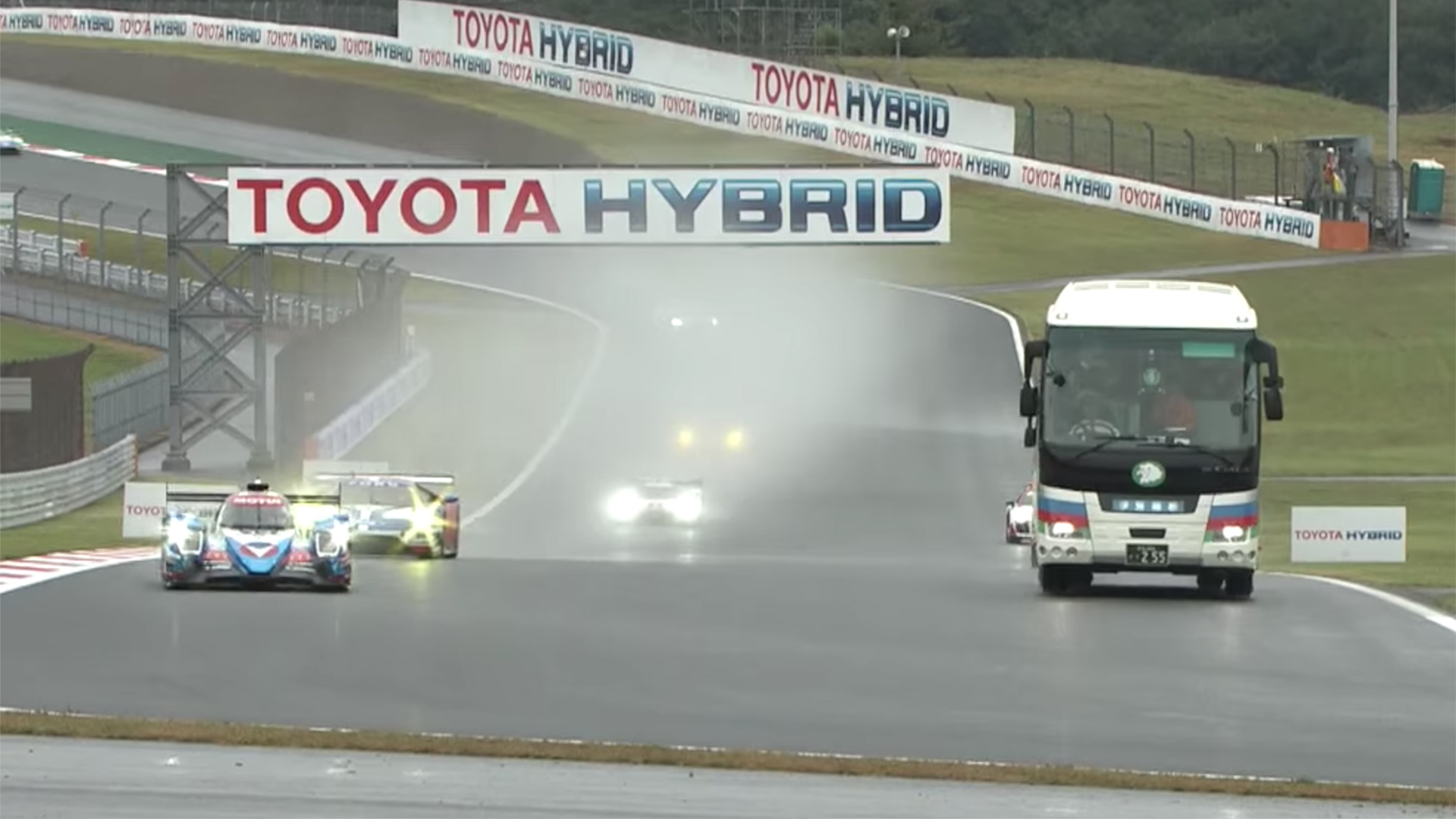 You’d think the buses would try to stay out of the way as much as possible, but the video also shows them taking the inside line on a few of Fuji Speedway’s turns and forcing drivers to miss the apex. It’s quite possible this is all part of the show; after all, the cars aren’t moving anywhere near full speed. Then again, that measure carries its own risks when you’re talking about machines that rely heavily on downforce for grip on a soaking wet track.