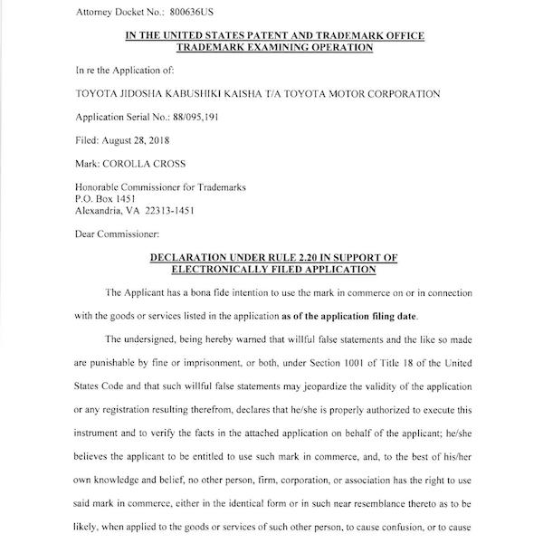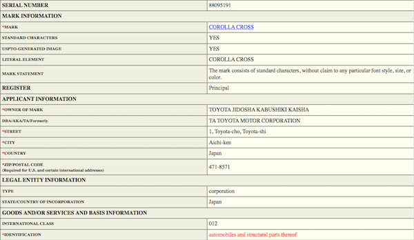 Toyota has filed for trademarks on the name “Corolla Cross” with the intellectual property bureaus of 13 countries plus Europe, as pertaining to “automobiles and structural parts thereof.”