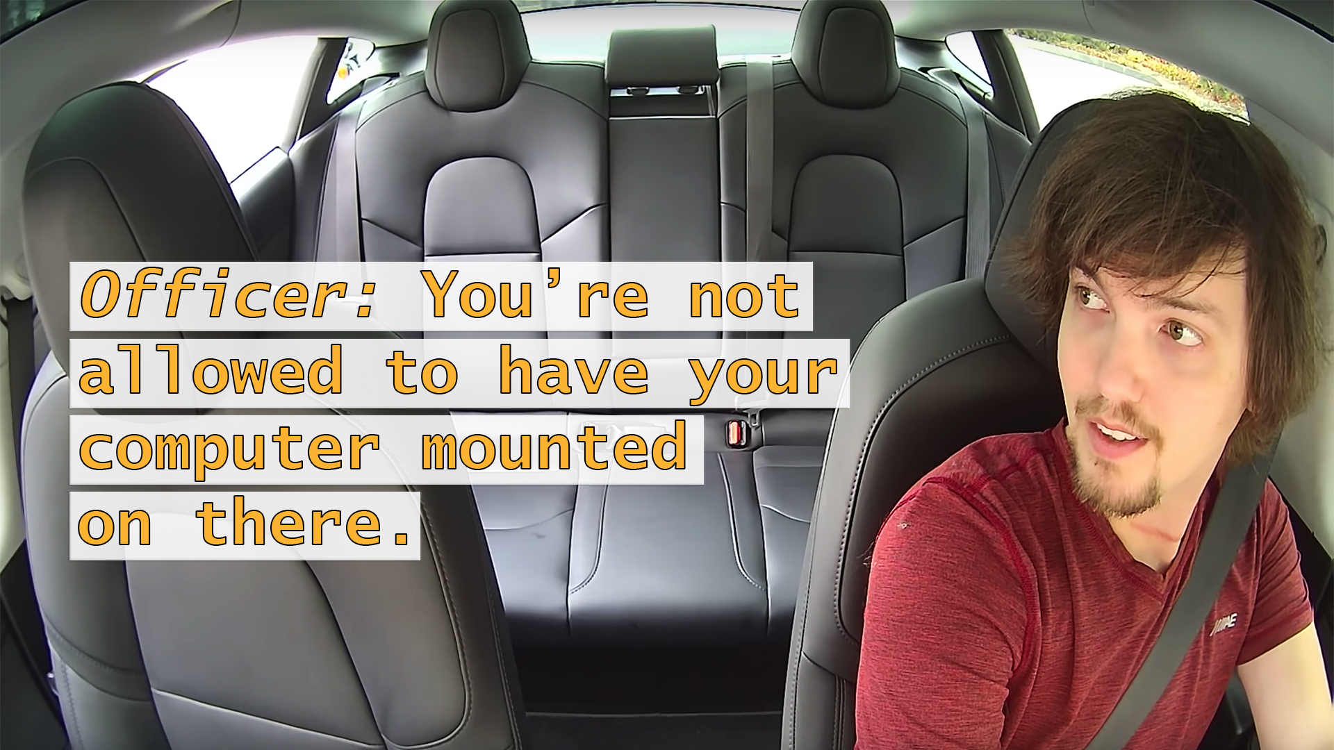 The officer opens by telling Hall that he’s “not allowed to have [a] computer mounted on there.” Hall pauses for a beat then laughs, thinking the officer is making a joke. “Could you help me take it off?” he replies in jest. But the cop is serious, saying that while it’s “kinda cool” that he’s got it rigged as a navigation system, it’s illegal to use such a big device while driving. Hall’s face turns to genuine surprise as he tries to explain that it’s the stock setup for the car.