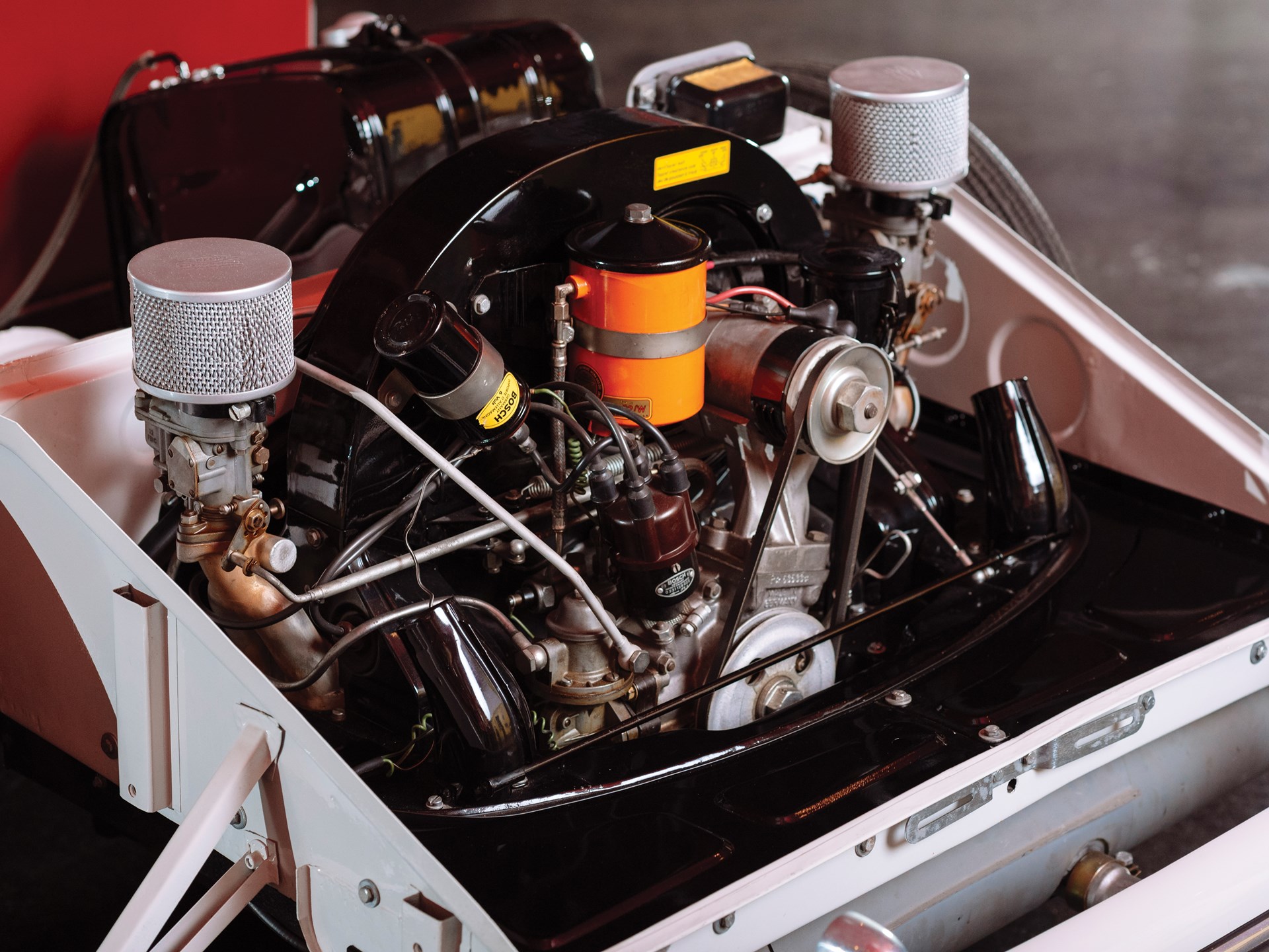 Aside from the lack of a body, this car is a standard 356 A, mating a warmed-over Volkswagen flat-four engine to a four-speed manual transmission. Fuel is supplied by a custom-made tank that only holds four gallons. That combined with the lack of a windshield may mean this is not a Porsche best-suited for long road trips.