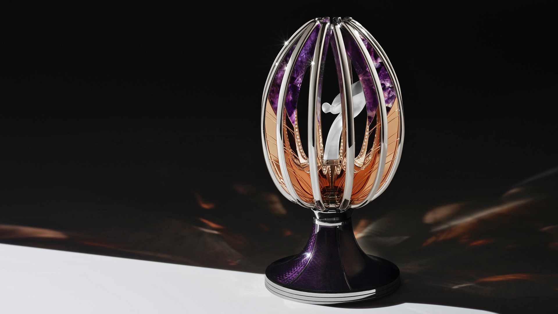 The Egg rests on an engine-turned, hand-engraved, purple enamel guilloché base of 18 karat white gold. Arms of rose gold define the shape of the Egg, acting as a protective chamber for the Egg’s precious inhabitant. Upon operating the movement via a discreet lever at the base of the stand, a sense of theatre ensues as the boughs open to present the fine figurine of the Spirit of Ecstasy, hand-sculpted in frosted rock crystal, standing nobly in her opulent surrounds. The rose gold vanes, embellished with nearly 10 carats of round white diamonds, resolve into swathes of natural amethyst weighing over 390 carats, specially selected for its colour saturation and quality. The purple hue of the enamel and amethyst provide a playful nod to the use of colour found in Fabergé’s heritage.